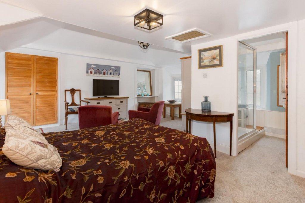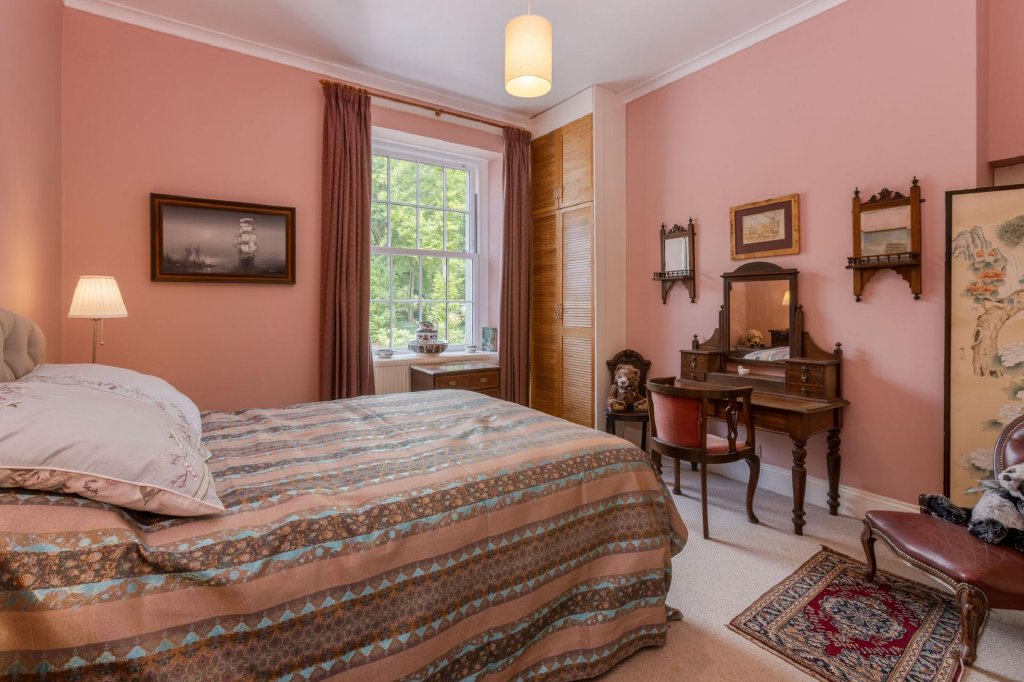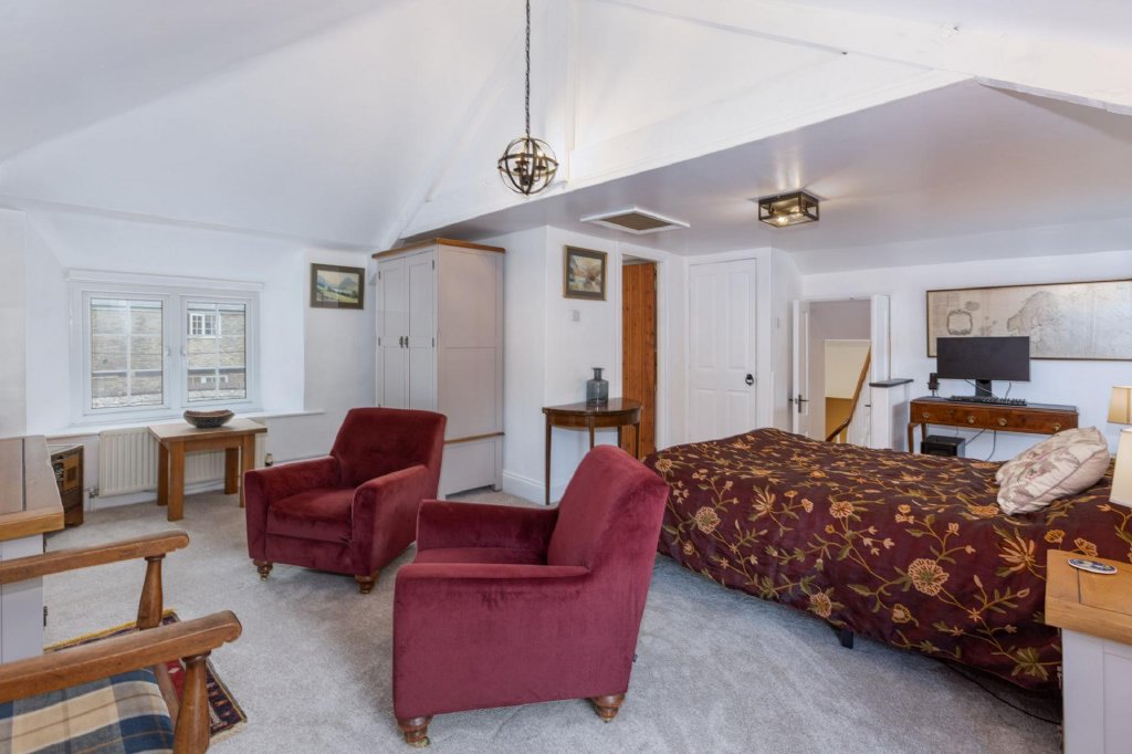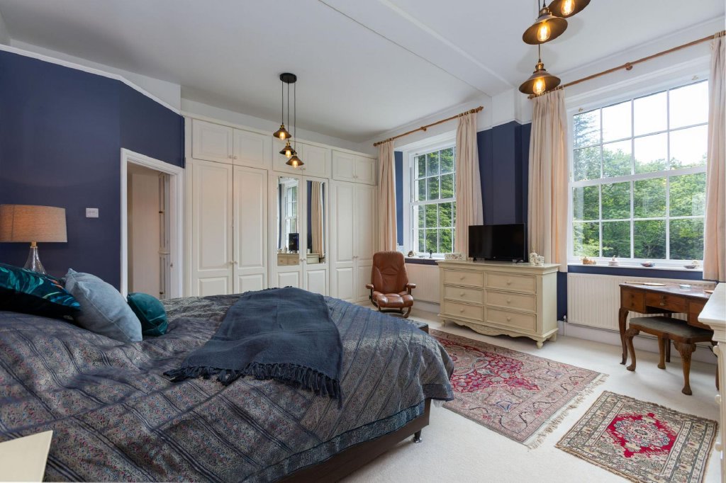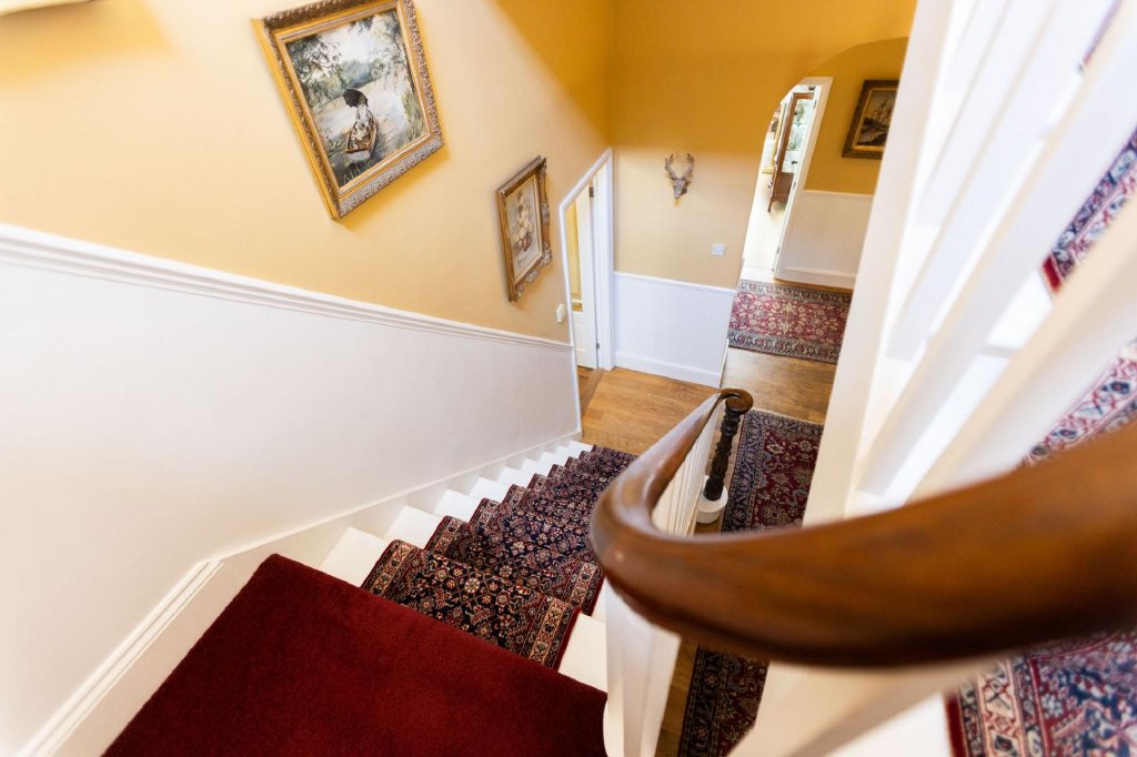 The staircase is another original feature, lit by a large window that fills the space with natural light. Upstairs, the annex bedroom offers another ideal setup for multi-generational living or a potential AirBnB rental. This spacious double bedroom includes an en-suite shower room, private entrance, and ample room to install a kitchenette, making it perfect for a fully self-contained studio annex.