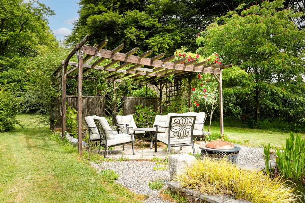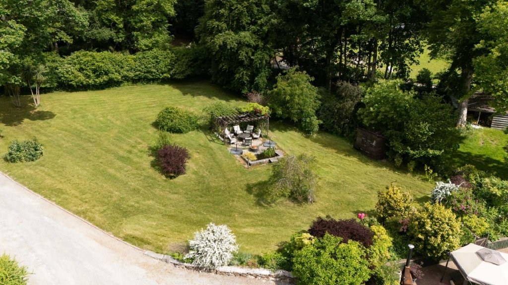 Hawkmoor House has a delightful mature garden filled with lawns, mature shrubs, and trees. Just outside the kitchen and breakfast room, you will find a spacious patio with a veranda, perfect for lively gatherings or peaceful morning coffees. Further along the lawn, is another patio area with a fishpond—an all-day suntrap!