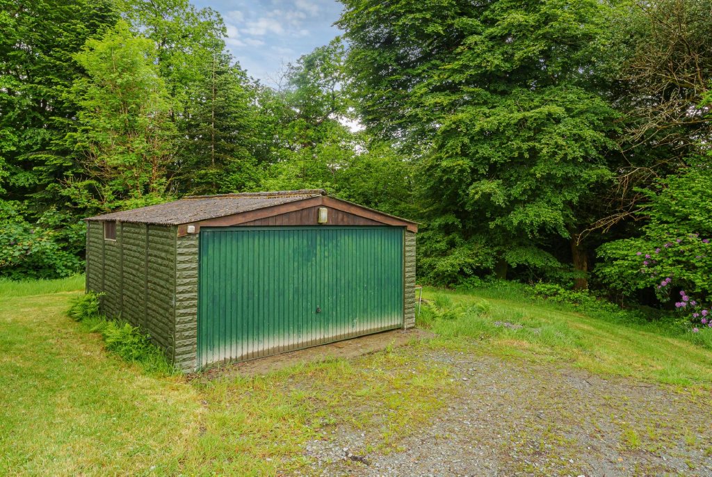 The property is approached via a long, private driveway leading to a large parking area with ample space for multiple vehicles. Adjacent to the drive, a timber workshop and garage provide excellent storage, with a second garage offering even more room for outdoor equipment. Additionally, a timber-framed, open-fronted barn offers convenient shelter for garden machinery or extra vehicle storage.