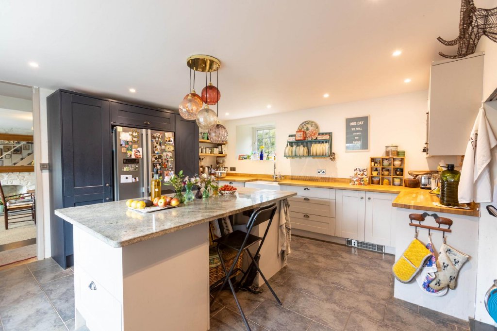 Upon entering, you are welcomed into a spacious, slate-floored entrance hall leading to a generous lounge, with character features such as stone surround fireplace with recently-installed wood burner for those cosy evenings! The heart of the home is the dining room with a patio door to the rear garden, then seamlessly flowing into a recently fitted kitchen, complete with oak and Italian Granite work surfaces, a central island, a Belfast sink and range cooker. A versatile home office/ 4th bedroom, a convenient shower room with WC and storage and utility room complete the ground floor. A further door from the utility room leads to the main terrace, perfect for entertaining or some alfresco dining!