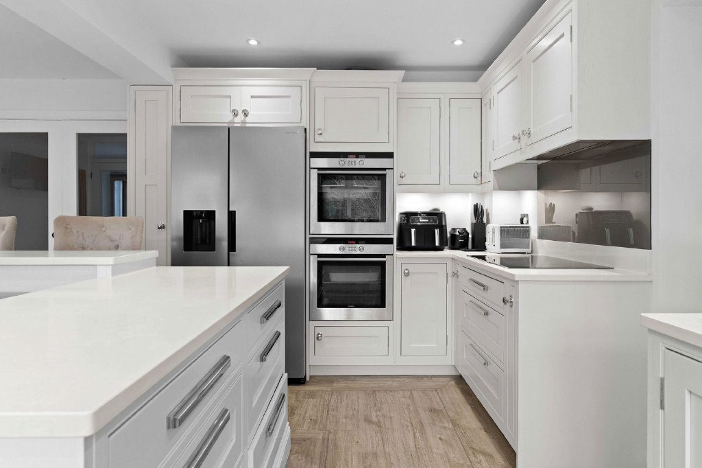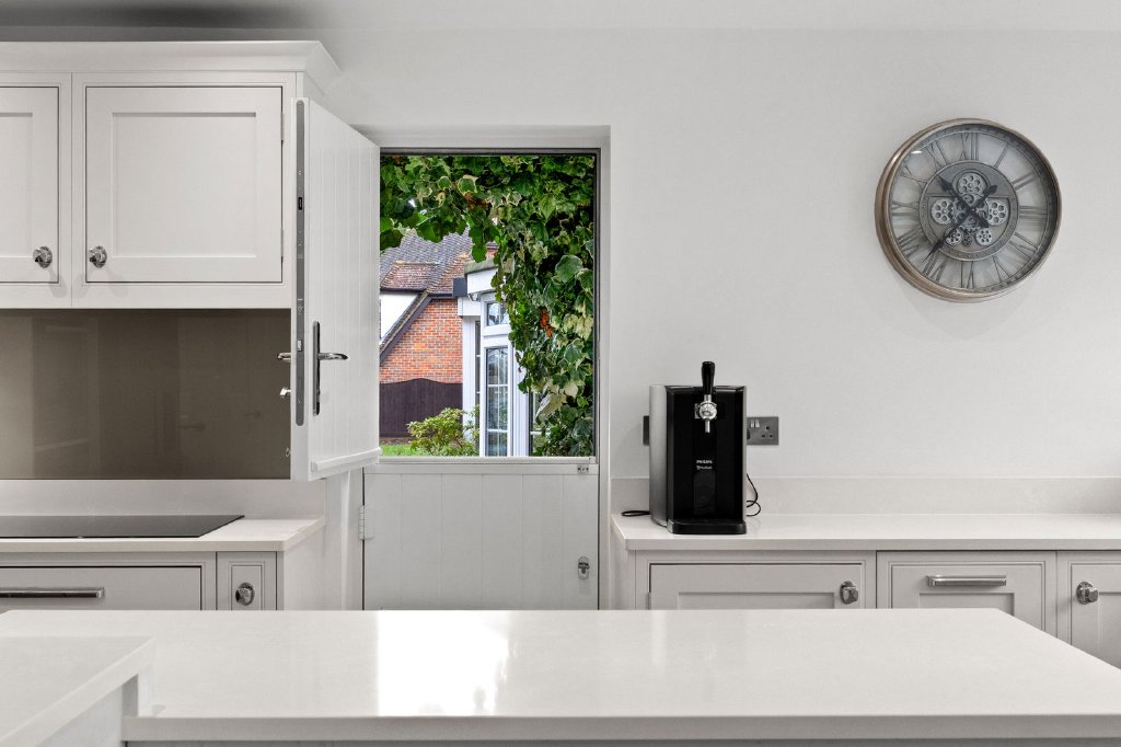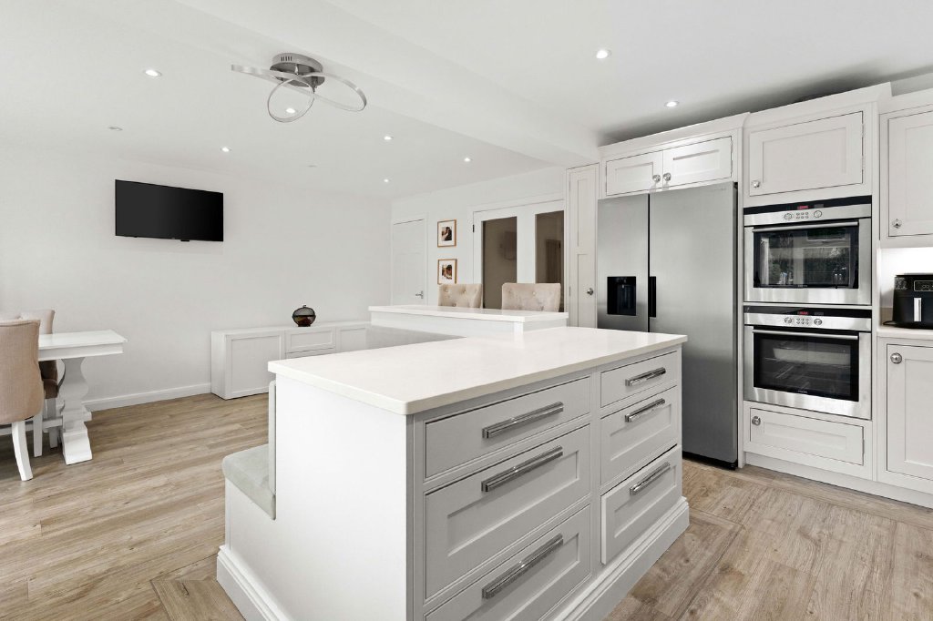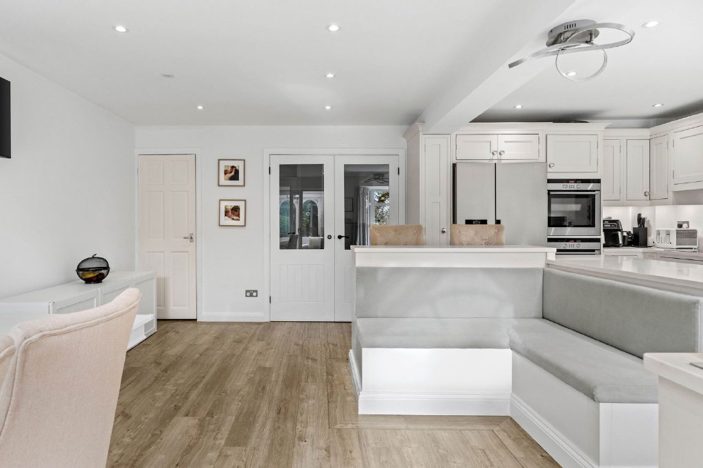 Double doors open into the stunning kitchen/dining/family room, designed for modern family living and entertaining. The Clarendon-designed kitchen is fitted with quartz worktops, a Bosch dishwasher and two Siemens ovens, complemented by banquet seating, a breakfast bar and additional dining space. A stable door provides access to the rear garden, while a conservatory leads out to the sun terrace and garden beyond.
