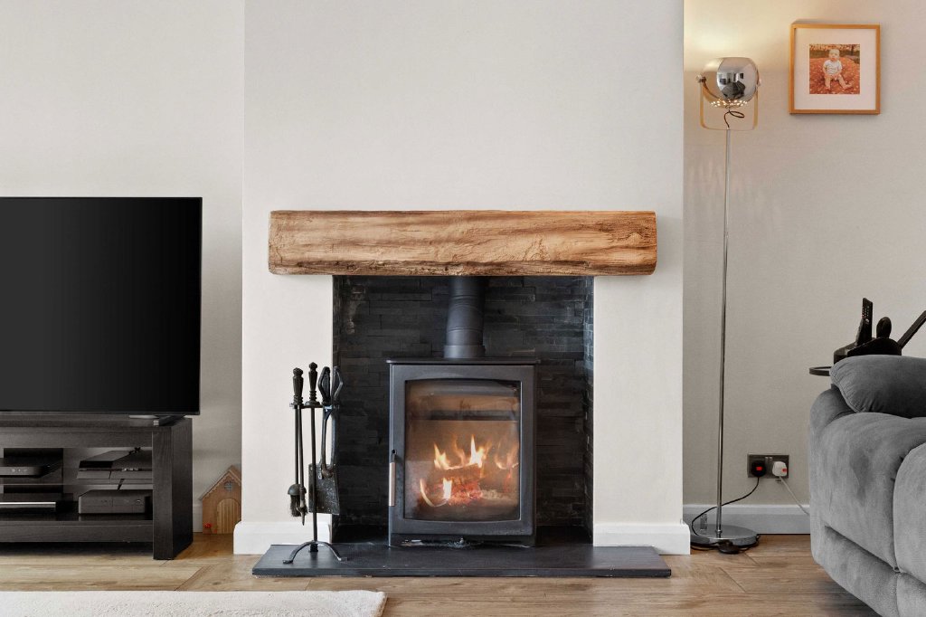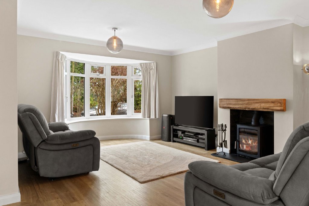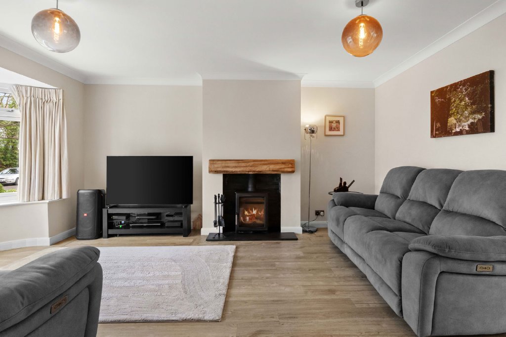 The property offers excellent kerb appeal with a paved driveway, car port and garage. Inside, a welcoming entrance hall with useful storage sets the tone for the stylish interior, featuring Amtico flooring throughout the hallway, living room and kitchen. The living room enjoys a bay window to the front and a charming wood-burning stove, creating a warm and inviting space.