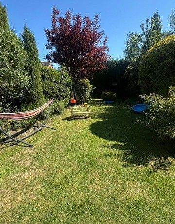 The south-easterly facing rear garden features a well-maintained lawn bordered by mature trees and shrubs, providing an ideal space for summer entertaining.