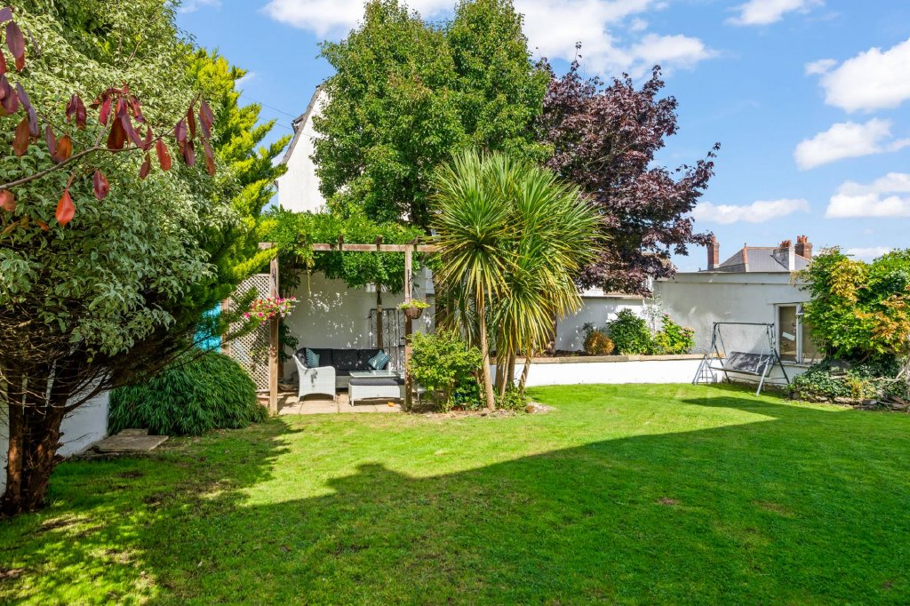 The property sits within secluded walled gardens, approached via double gates opening to a level driveway and a detached double garage with electric door. The gardens are landscaped with lawns, established beds, and mature trees, providing both beauty and privacy. A south-facing paved terrace, framed by a wisteria-clad pergola, creates the perfect setting for al fresco dining and summer entertaining.