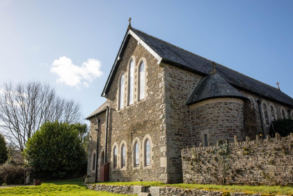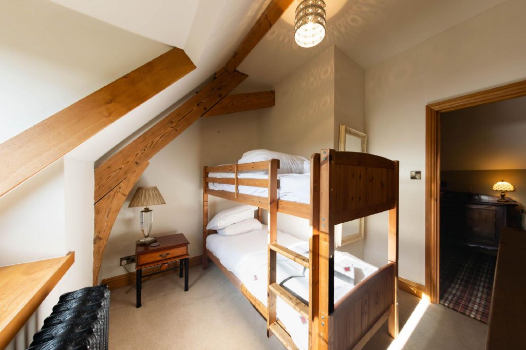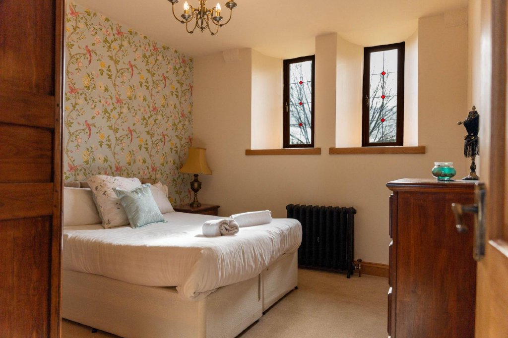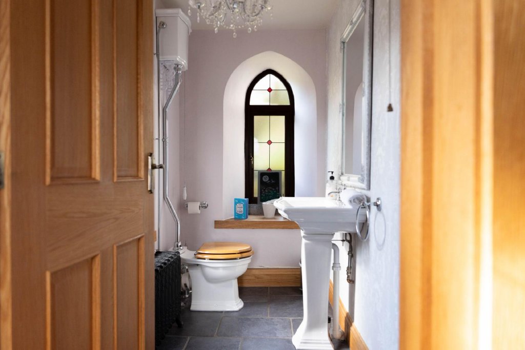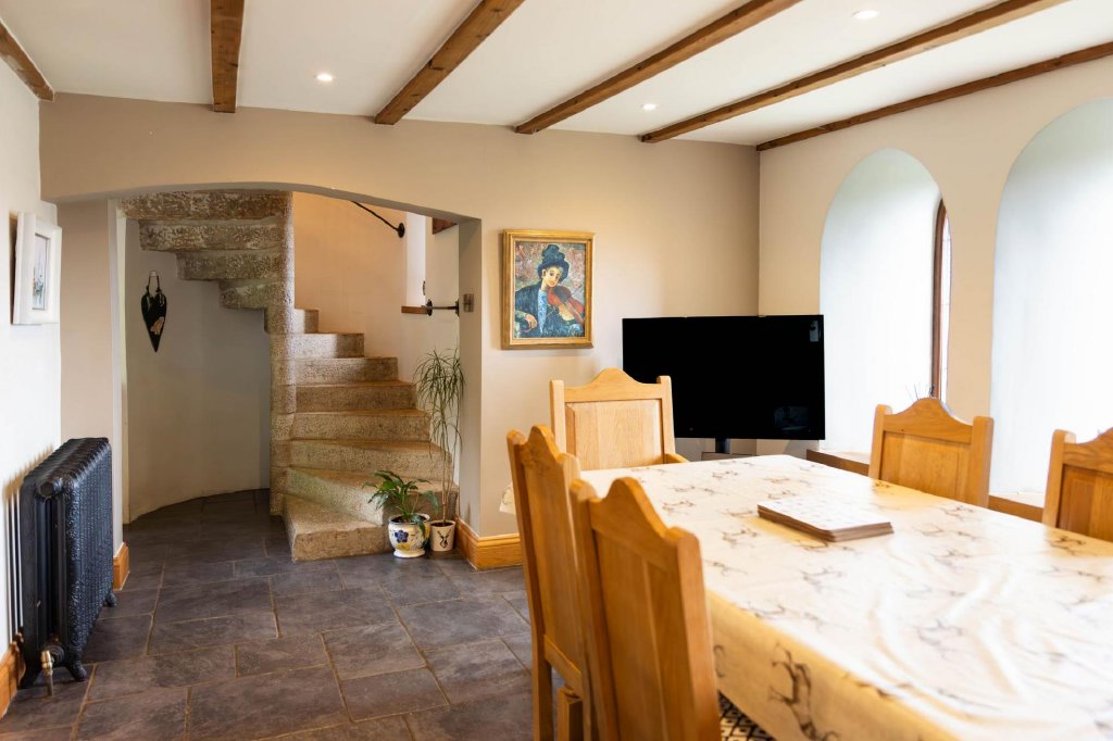 The original staircase leads to the ground floor, where a grand sitting room showcases high ceilings, exposed granite, and large windows, creating an elegant and inviting space. Along the hallway are two double bedrooms and a family shower room. At the end of the hallway, an original church door opens to the front of the property. Adding to its charm, the house even features a working church bell, which you’re welcome to try when you visit!