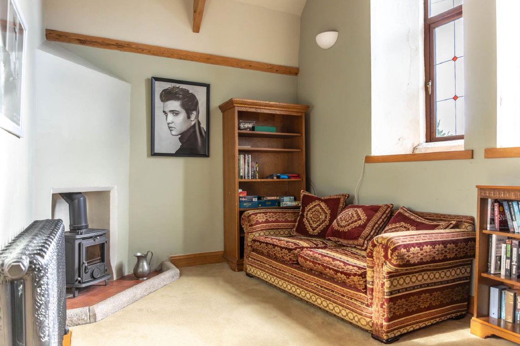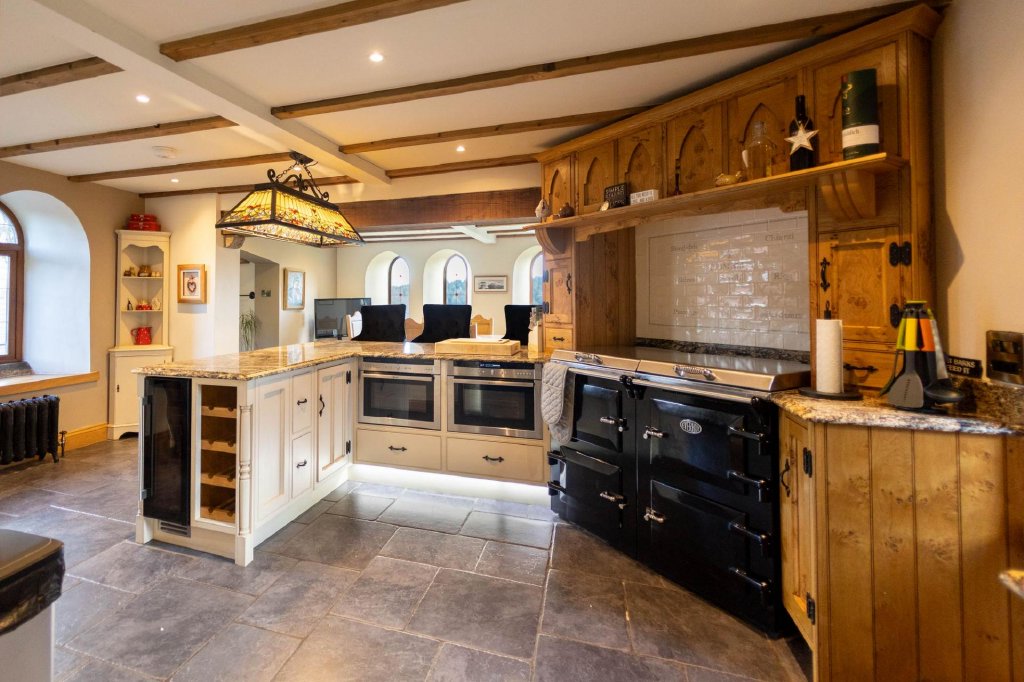 On the lower ground floor, the spacious kitchen/dining room offers ample space for entertaining, with stunning valley views, a wood burner, and original features such as exposed beams and granite window surrounds. This level also includes a plant room, W.C., and a handy boot room.