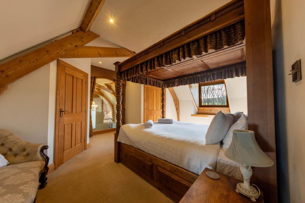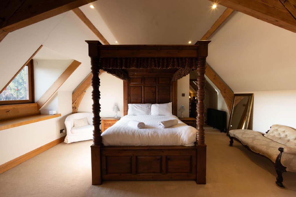 Nestled within the grounds, The Lodge is a cosy wooden cabin with stunning views over the surrounding countryside. It includes a bedroom with a wood burner, a kitchen, and a shower room. With its own private entrance and parking, it is currently used as a successful holiday let.