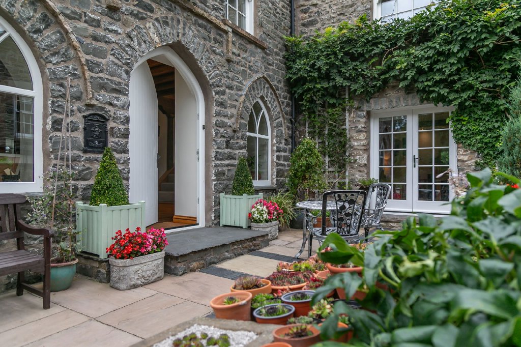 Quiet and private gardens surround the house and have been landscaped in ‘rooms’ to create individual pockets of interest and useable spaces for differing purposes. They are gently tiered to maximise the slightly sloping site and include a choice of seating areas depending on whether sun or shade is required and whether you’re dining or reclining. The last rays of the day are on the dining terrace where a notable feature is a stone curved bench, built from reclaimed materials with a wooden made to measure dining table. Once home to a hot tub, there is a power supply on this flagged terrace.