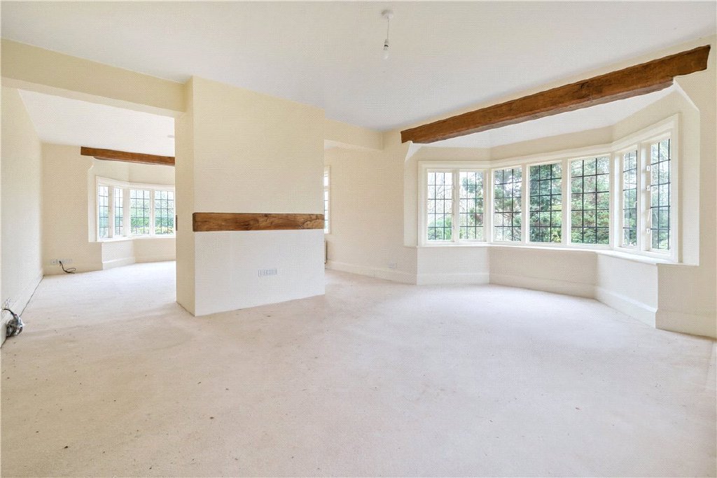 The large sitting room is partially divided to offer two reception rooms, both with large bay windows overlooking the house gardens.