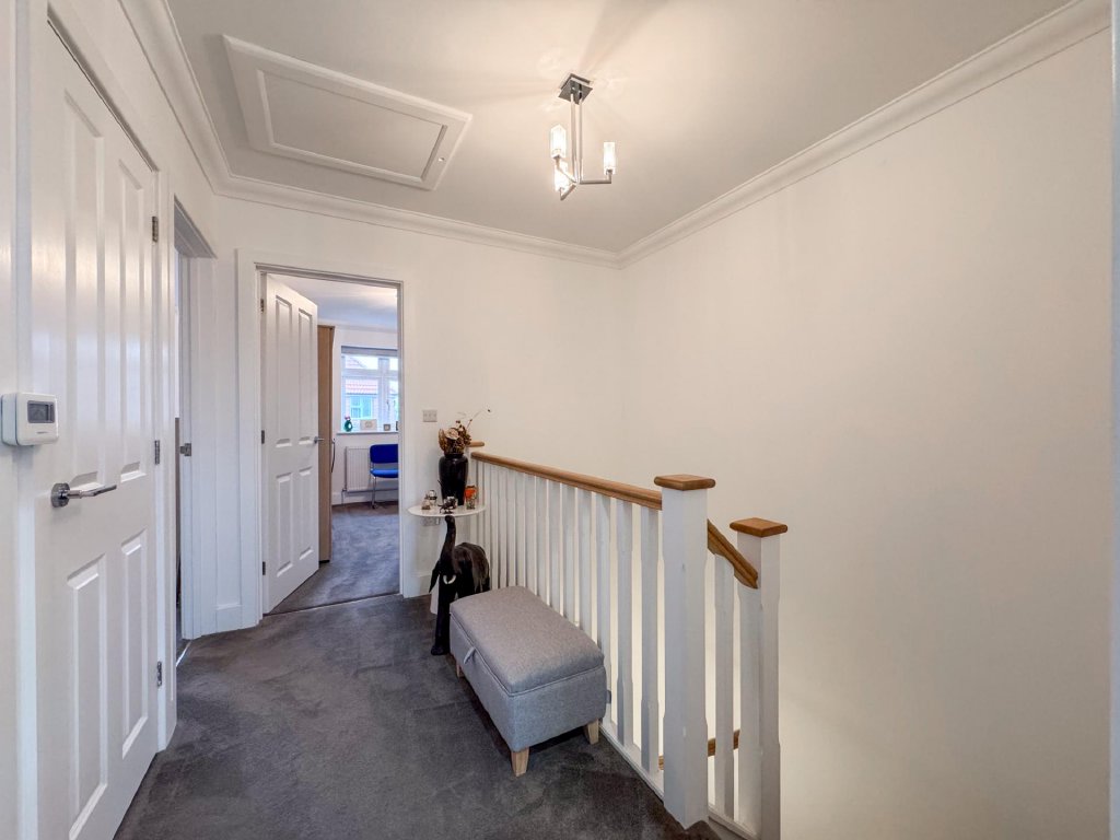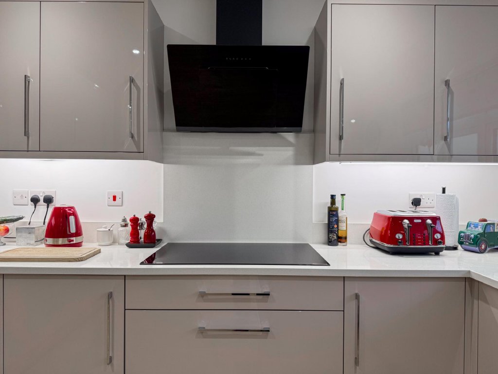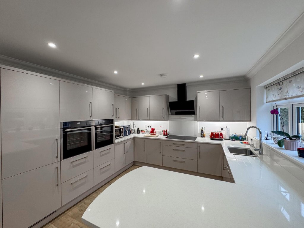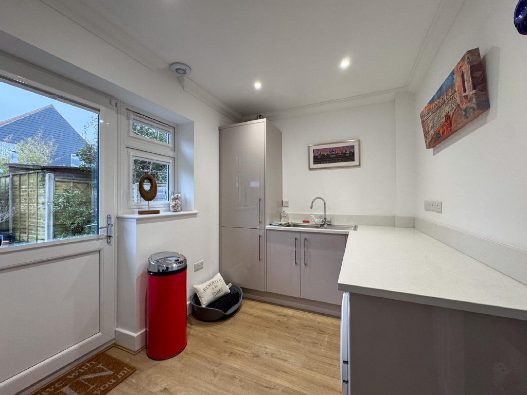 The heart of the home is the impressive kitchen family room, an elegant, light-filled space with high gloss cabinetry, quartz worktops, premium Neff appliances, under-unit lighting and bi-fold doors opening directly onto the garden, creating a seamless indoor–outdoor flow. A separate utility room adds practicality with additional storage and laundry facilities.
