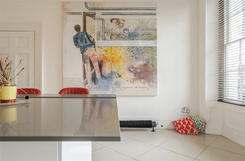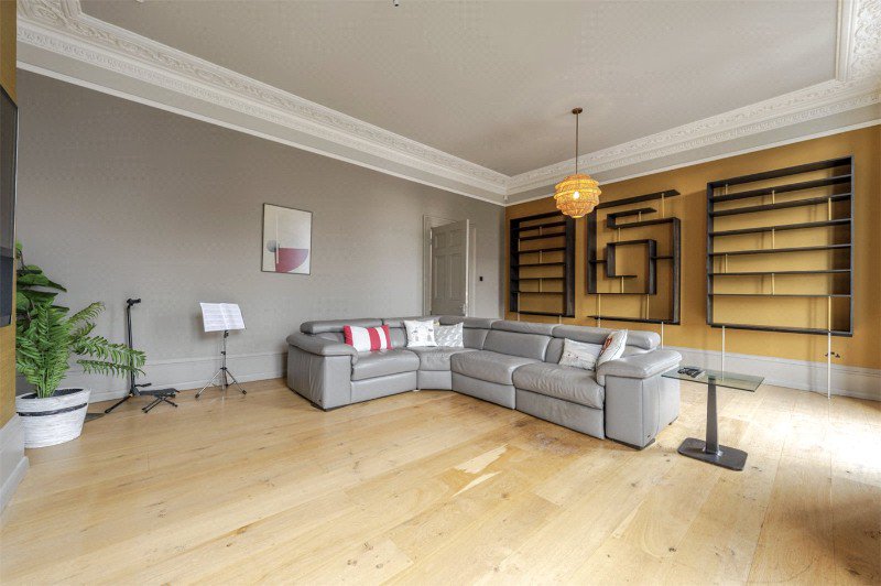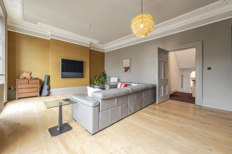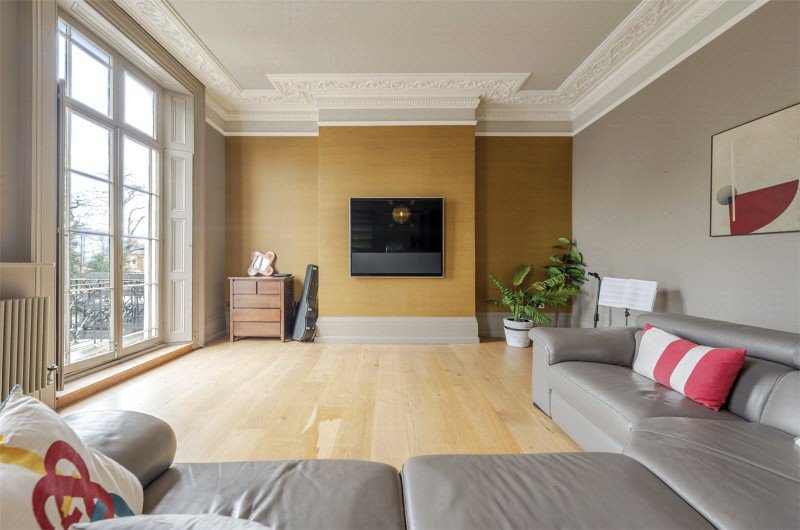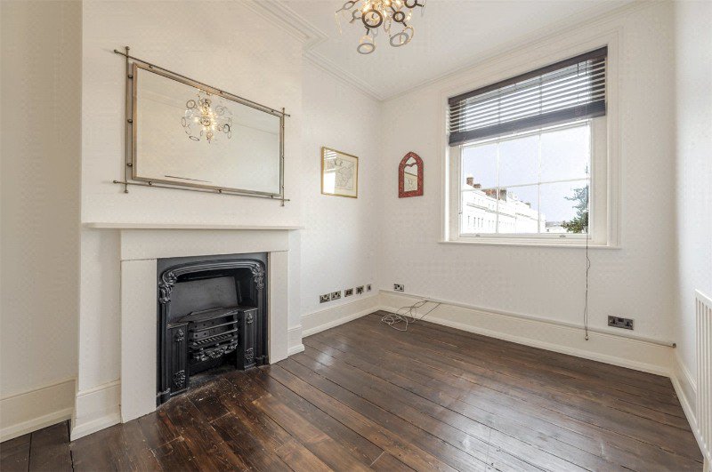 The first floor is home to the principal drawing room, an elegant and beautifully proportioned space with tall ceilings, ornate cornicing and double doors opening onto a balcony with outstanding views across Clarendon Square’s communal gardens. This floor also accommodates the principal bedroom with a hidden, compact en-suite WC and fitted wardrobes, alongside a family bathroom and a discreet utility room positioned off the landing.