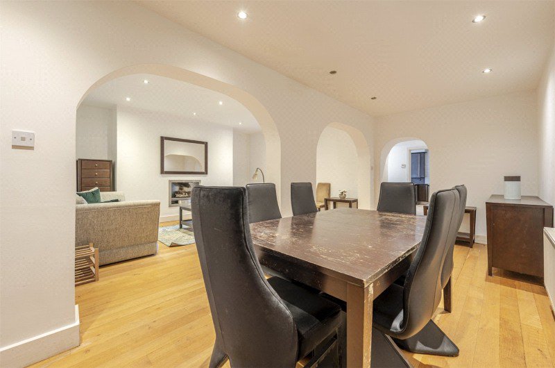 To the front, the generous breakfast room enjoys tall sash windows overlooking the square and connects seamlessly through to the contemporary kitchen, which is fitted with sleek cabinetry, integrated appliances and a central island, creating an excellent space for both everyday living and entertaining.