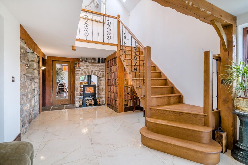 Entering the home, you are welcomed into a dramatic grand foyer with soaring vaulted ceiling, log burner and a striking oak staircase with decorative ironwork and a hidden cloakroom with WC. Stonework, porceline flooring, and original timber elements provide a sense of heritage and craftsmanship, while an 8 foot crystal chandelier adds an elegant focal point.