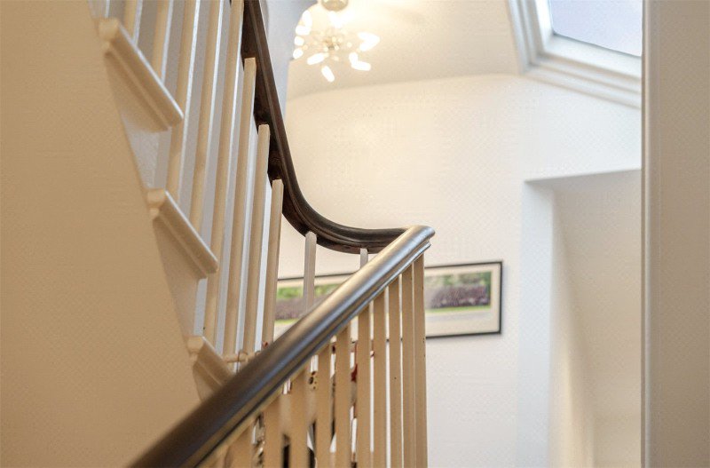 Stone steps rise to an elegant portico entrance framed by classical detailing, opening into a welcoming reception hall with tiled flooring and the principal staircase rising through the house. The ground floor benefits from underfloor heating, providing modern comfort while retaining period character.