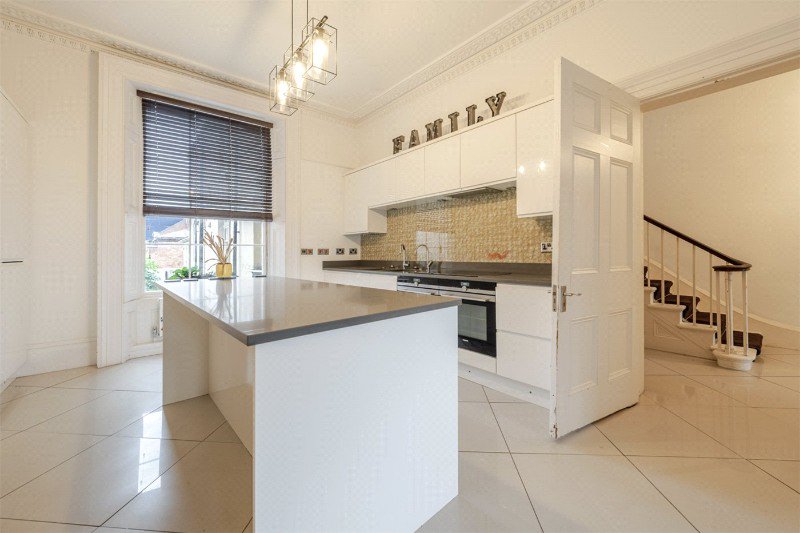 To the front, the generous breakfast room enjoys tall sash windows overlooking the square and connects seamlessly through to the contemporary kitchen, which is fitted with sleek cabinetry, integrated appliances and a central island, creating an excellent space for both everyday living and entertaining.