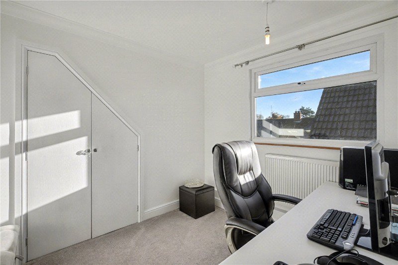 Externally, the property enjoys a delightful, sunny lawned garden with a striking silver birch tree and a generous patio area, perfectly suited for outdoor dining and entertaining. A pathway leads to a detached external room, offering excellent potential as a home office, gym, studio or recreational space, depending on individual requirements.