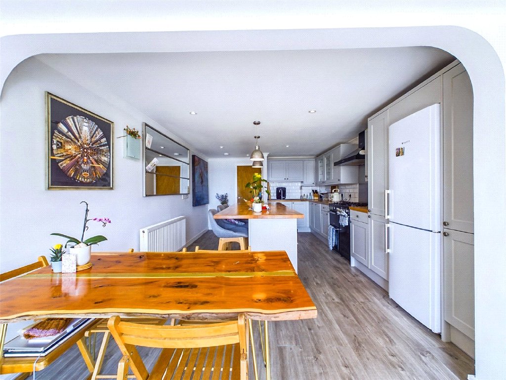 The kitchen/living area is sleek and modern, with plenty of eye and base level units, with an island and breakfast bar to the centre, and a features a range of integral appliances. Bifolding doors provide access to the rear patio and gardens.