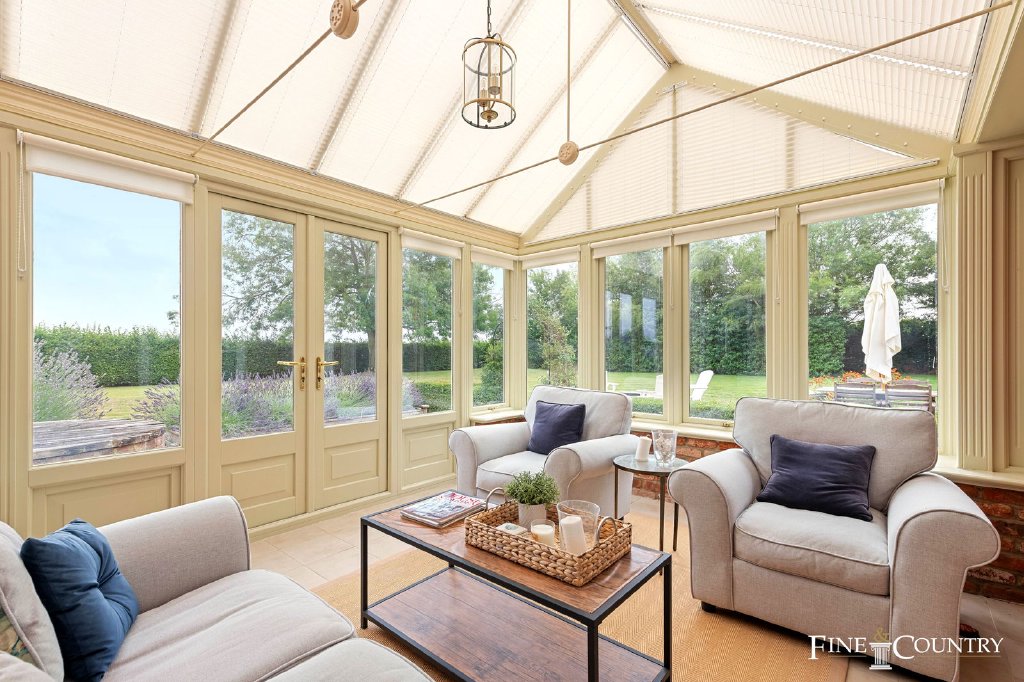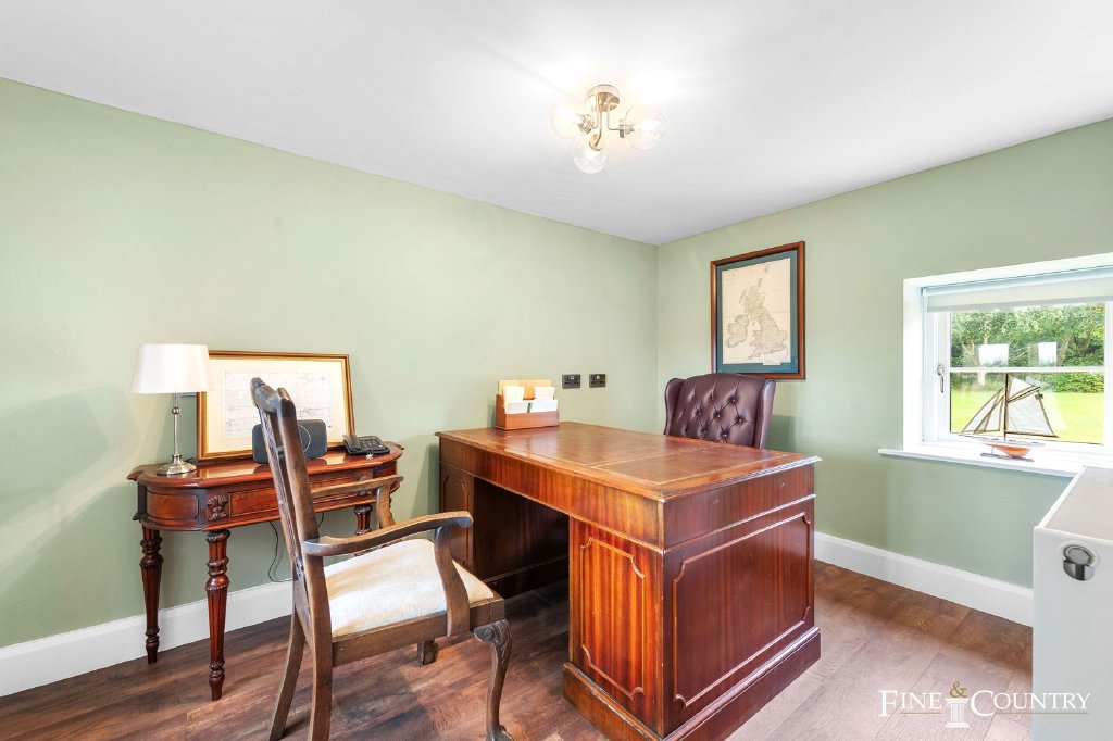 One of the most distinctive rooms is the garden room, a tranquil space with views over the rear terrace and sandstone fire pit. Part conservatory, part retreat, it opens onto the garden and provides the perfect setting for morning coffee or summer evenings under the stars. A study and guest WC sit adjacent, adding flexibility and privacy to this end of the house.