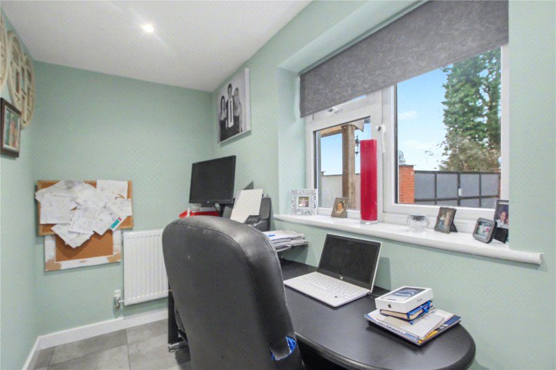 A characterful sitting room with exposed beams and a feature fireplace provides a warm and inviting retreat, while a garden room enjoys direct views over and access to the grounds. Further ground-floor accommodation includes a study and a well-appointed family bathroom, enhancing the home’s adaptability for home working or multi-generational living.