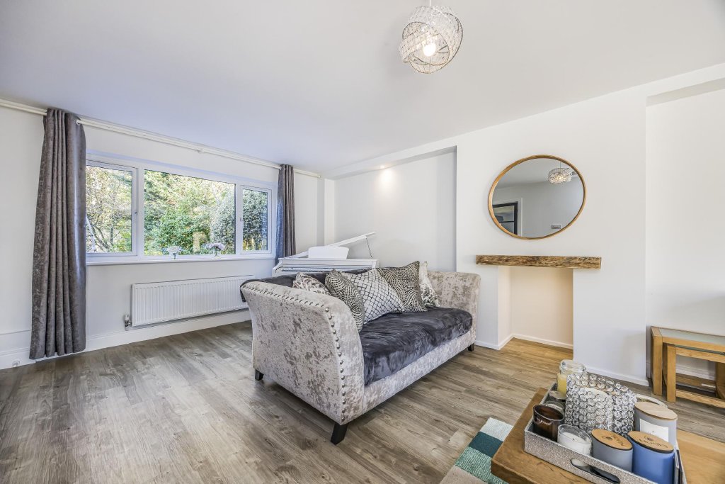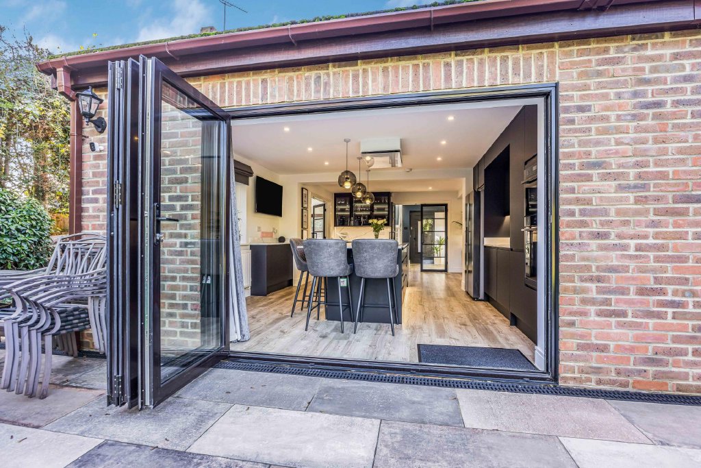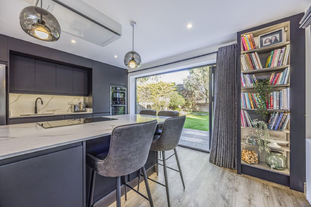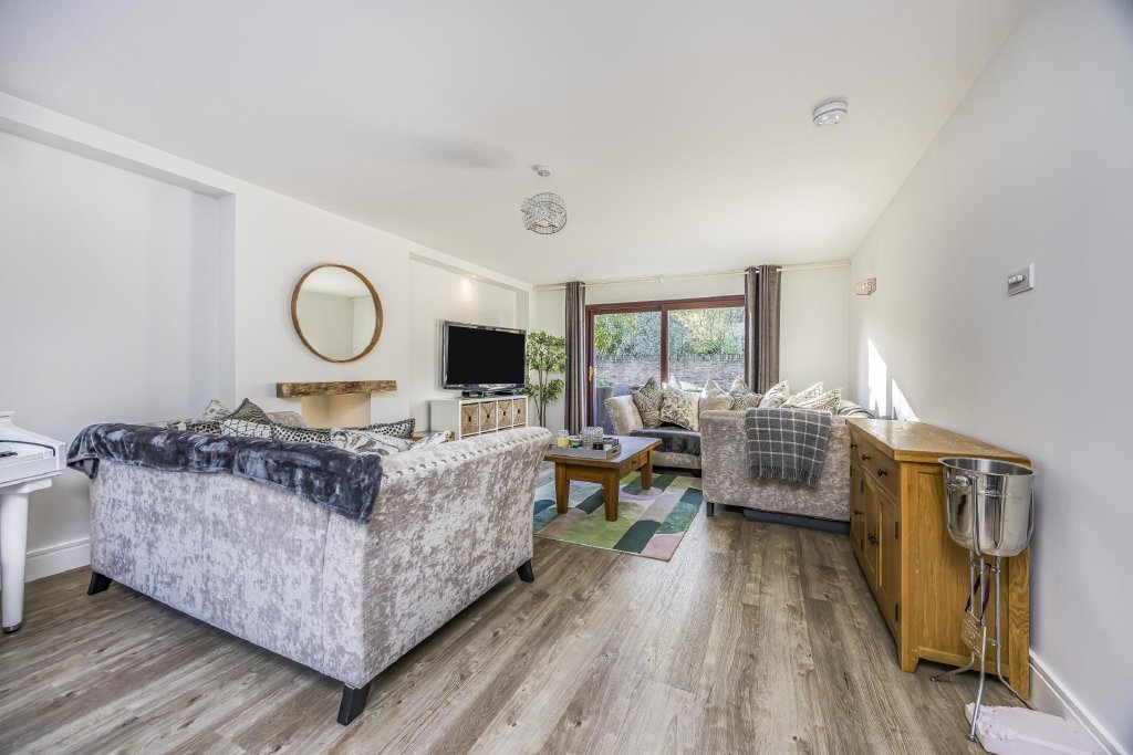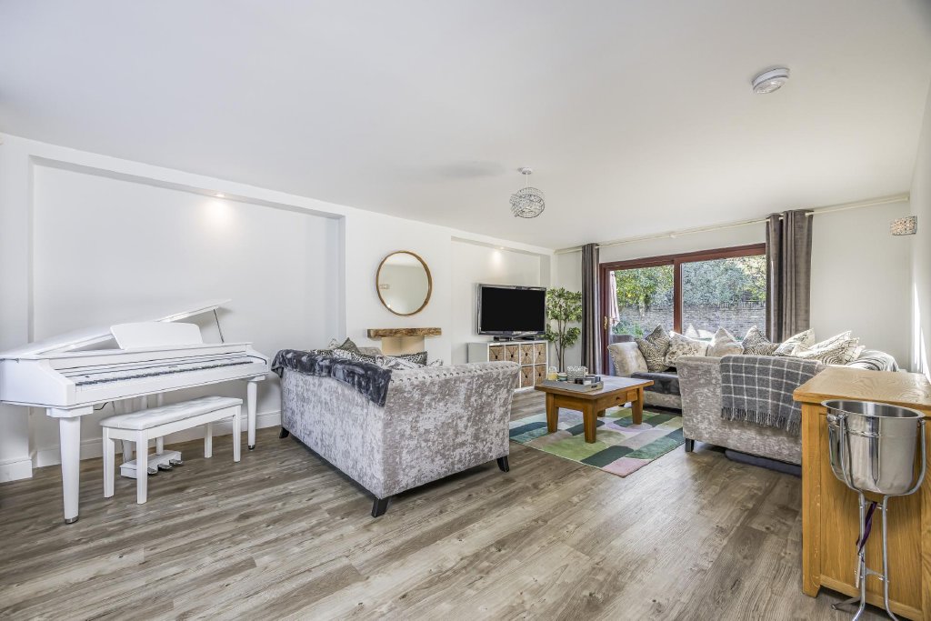 A further set of glass doors leads from the kitchen area to the family Sitting Room. A room of good proportions with sliding patio doors leading to the private walled garden and a south-facing view over the rear garden.