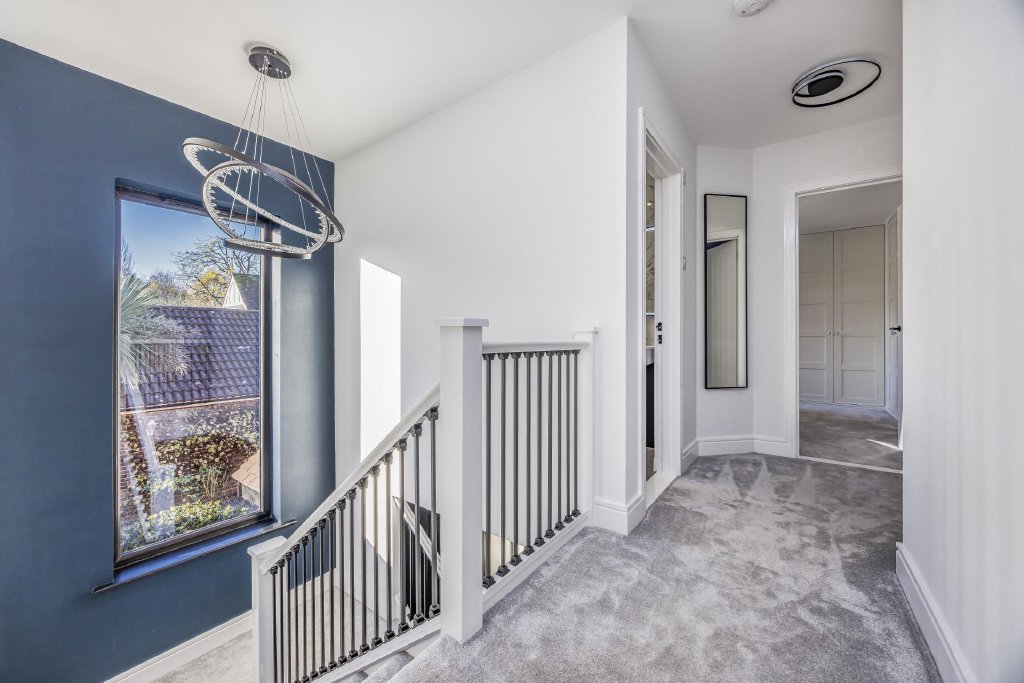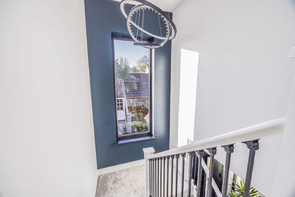A tall landing window set within a dark-frame and surround with lighting, provides a very attractive feature, particularly when daylight fades of an evening.