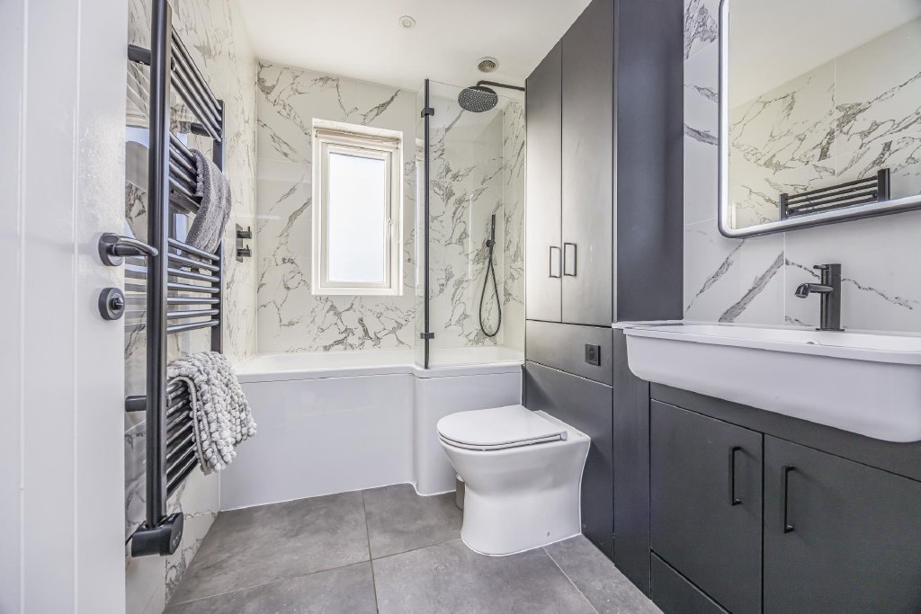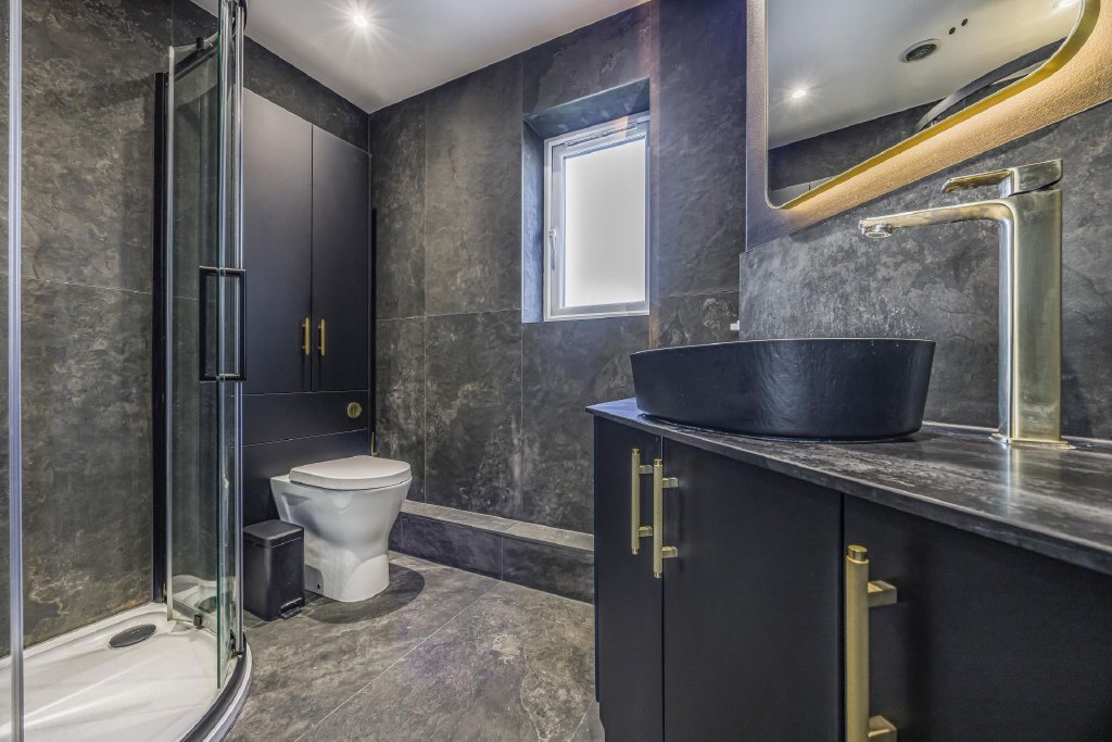 The Family Bathroom, with a bath and shower over, is fully tiled and fitted with matching storage and vanity unit.