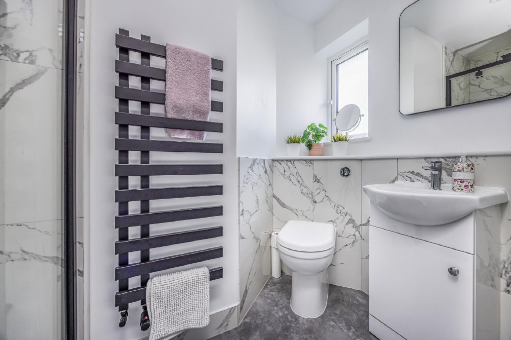 There is access to the loft, which is fully boarded and houses the high-pressure water cylinder.