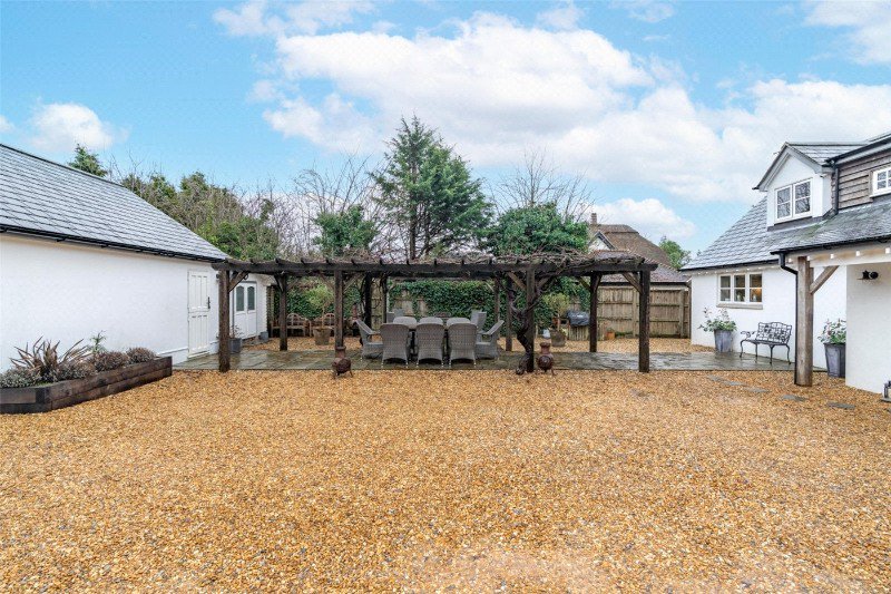 The property stands on a large, private corner plot accessed off Bakers Lane through electric double gates opening onto a large gravelled parking area. There is a large timber pergola (with climbing shrubs) over a paved area ideal for al fresco dining.