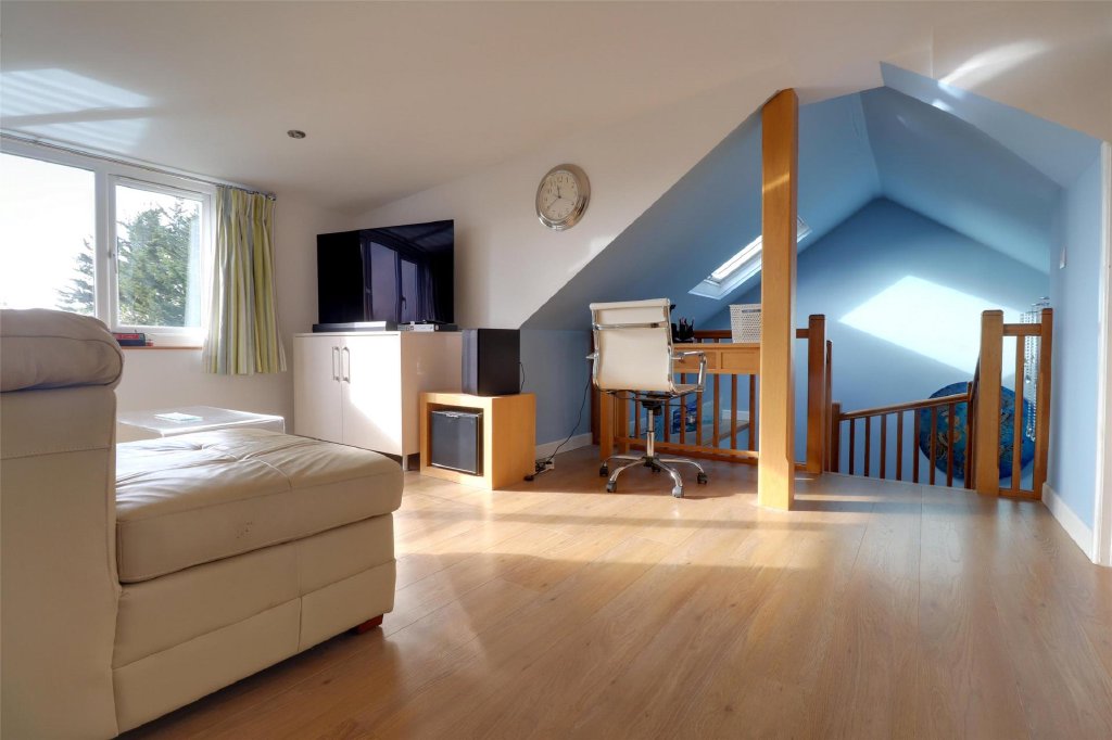 The accommodation is both generous and flexible, offering four well-proportioned bedrooms and two bathrooms, together with a first-floor TV lounge / occasional fifth bedroom, providing genuine scope for multi-generational living or dual occupation, if required.