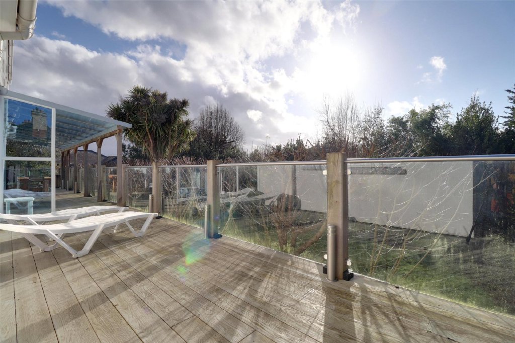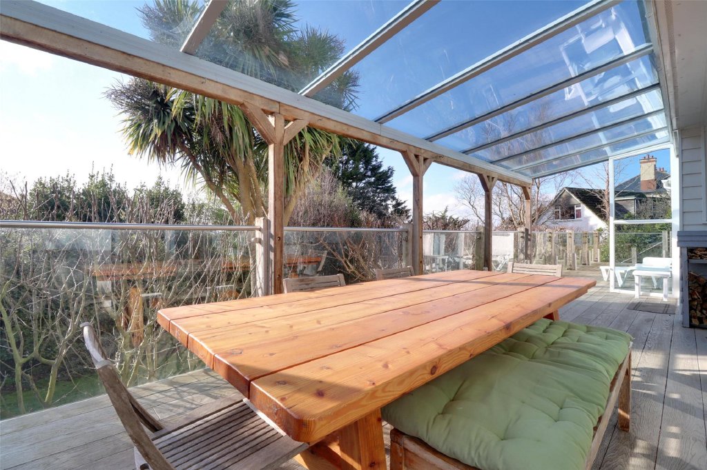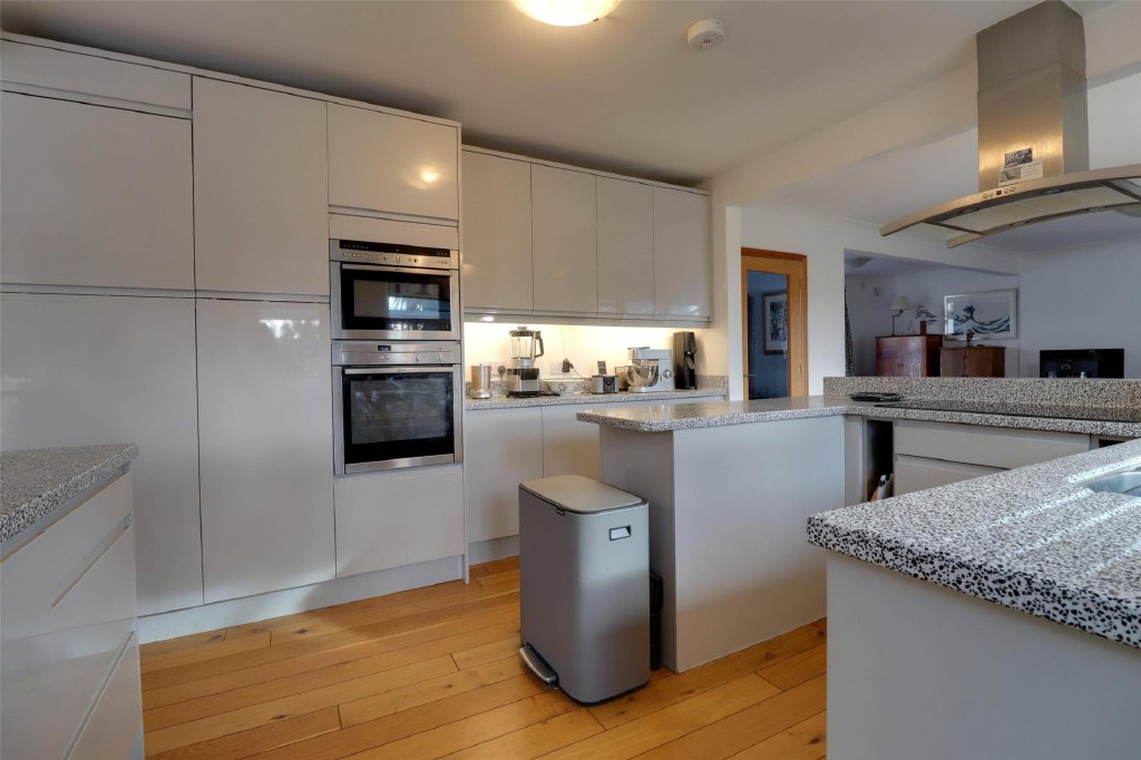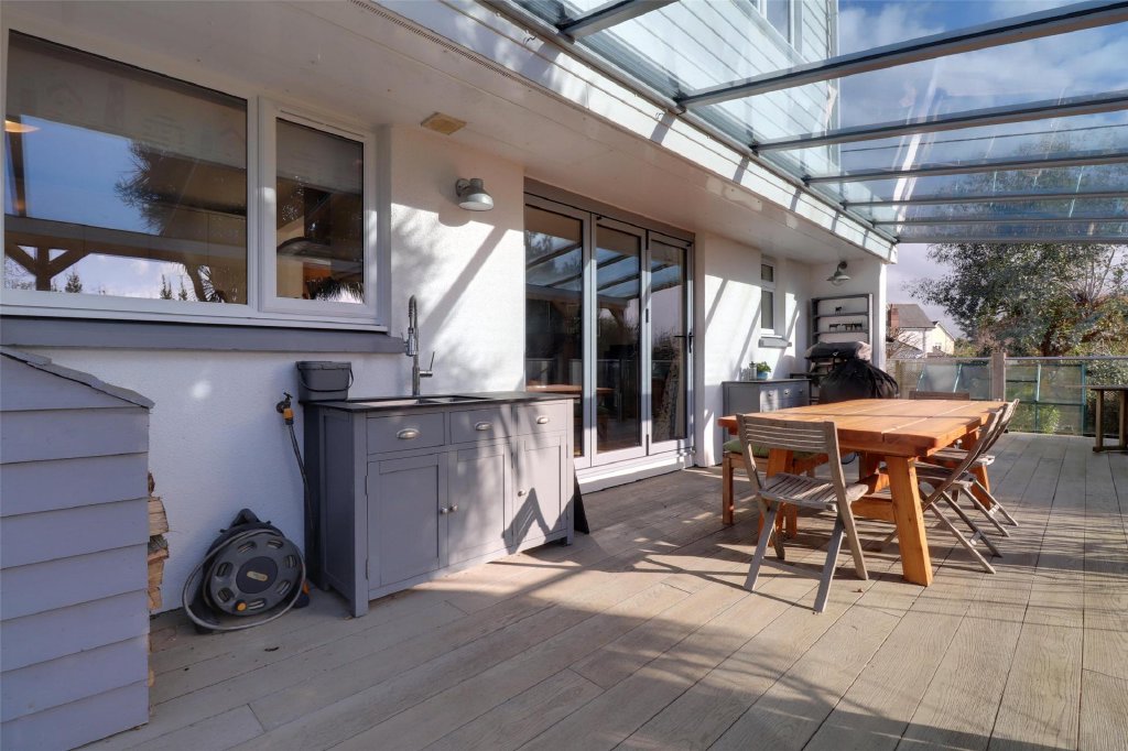 The heart of the home is a striking open-plan living, dining and kitchen space, designed for both everyday living and entertaining, with doors opening directly onto an extensive south-facing sun deck, partially covered and incorporating a well-designed outdoor kitchen. From here, the outlook is across the beautifully established rear garden and beyond towards the Taw Estuary and Braunton Burrows, creating a superb backdrop for alfresco dining and summer evenings.
