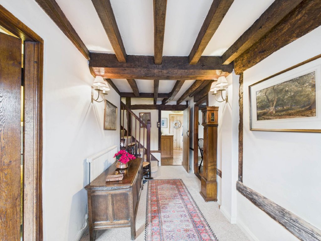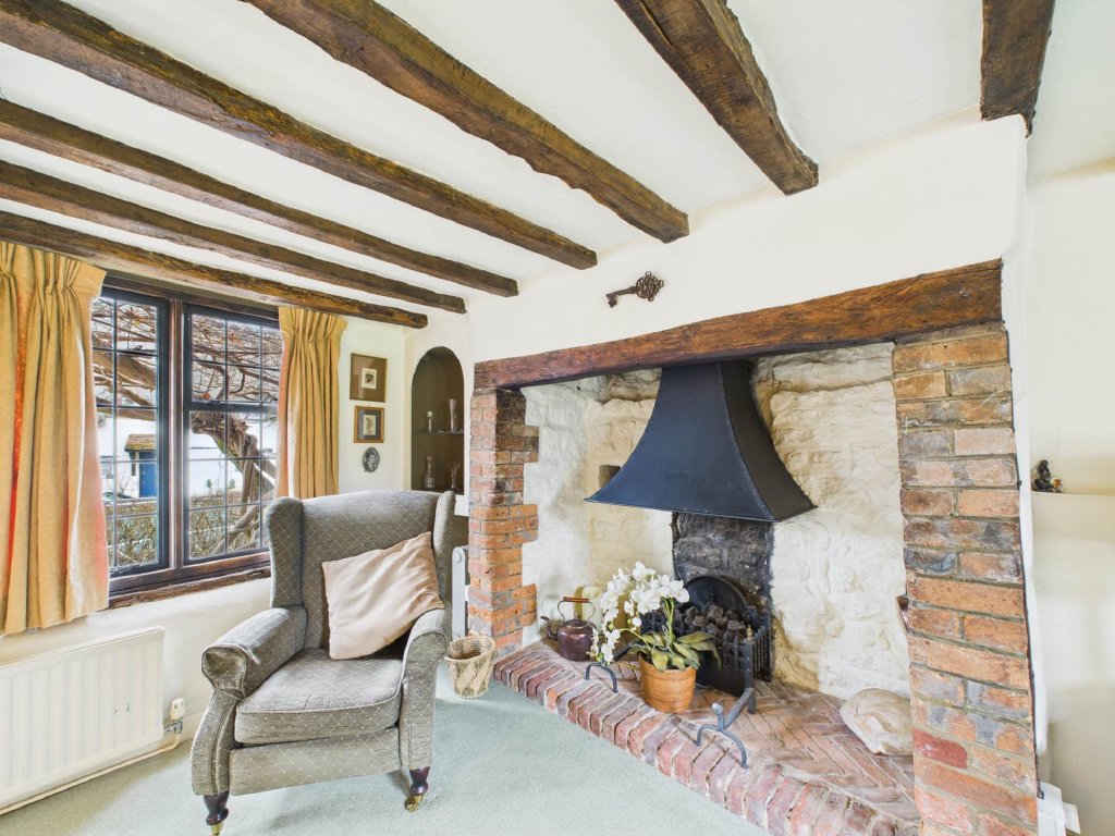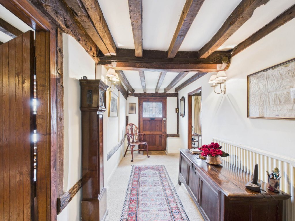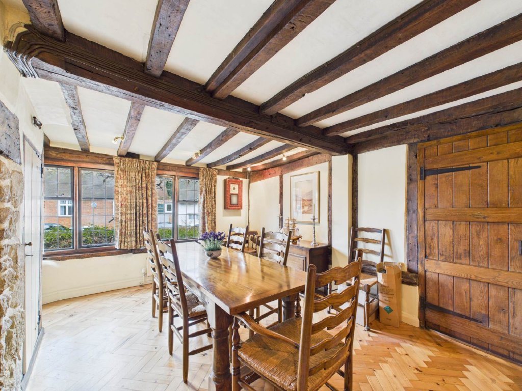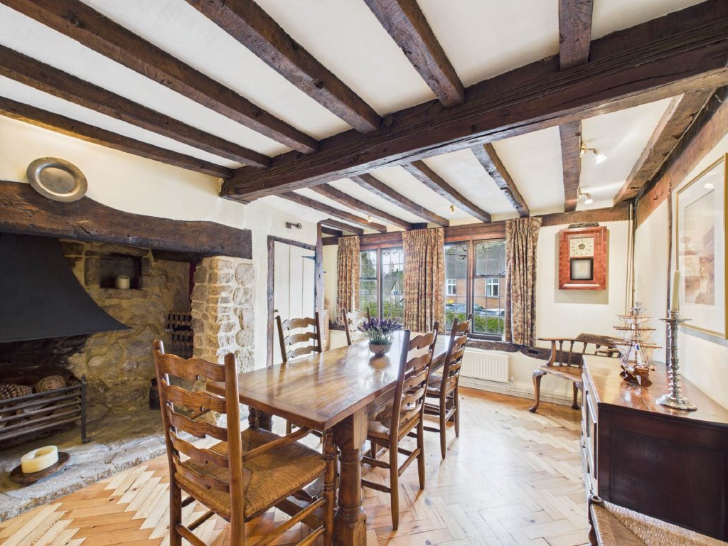 The front door opens into a welcoming entrance hall, from which the principal reception rooms unfold. At the front of the house, both the dining room and the double-aspect sitting room enjoy cosy inglenook fireplaces, exposed timbers and a warm, intimate atmosphere that perfectly reflects the home`s heritage.