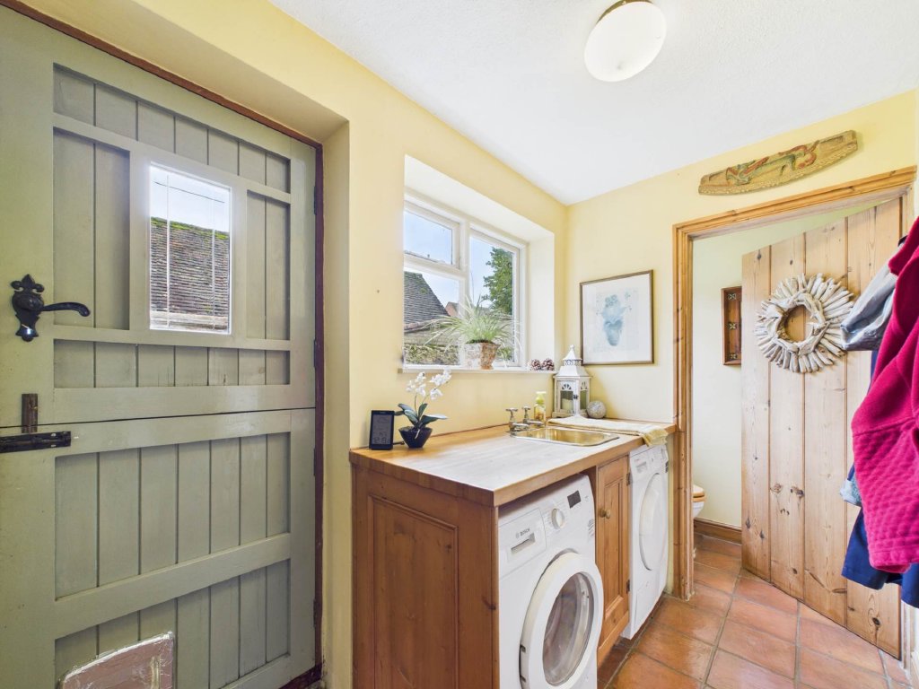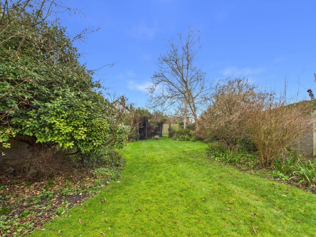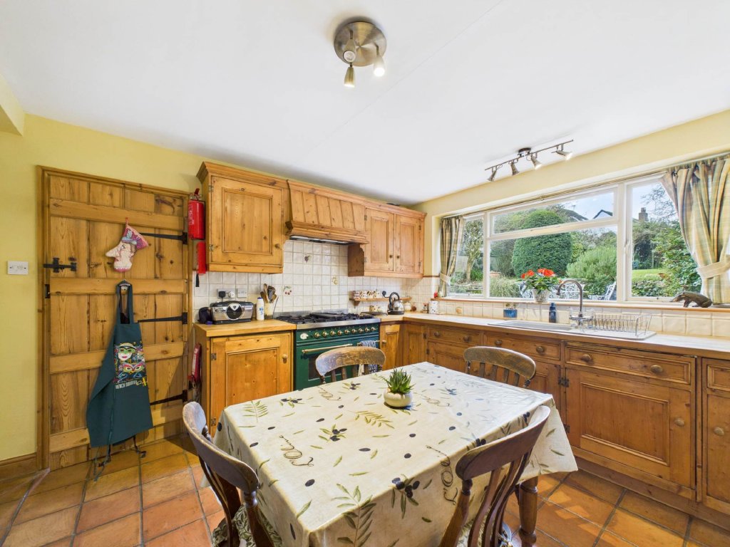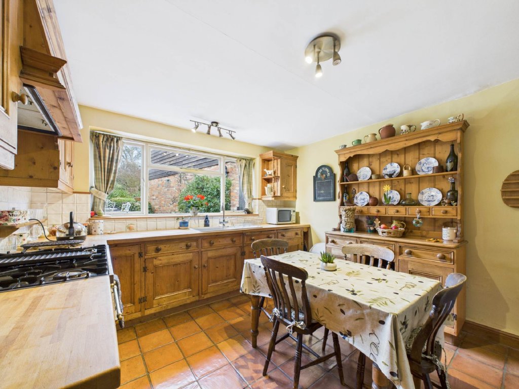 To the rear, the kitchen/breakfast room is fitted with classic Shaker-style cabinetry and enjoys views across the garden, providing a practical yet characterful space for everyday living. A separate utility room and ground-floor cloakroom add further convenience.