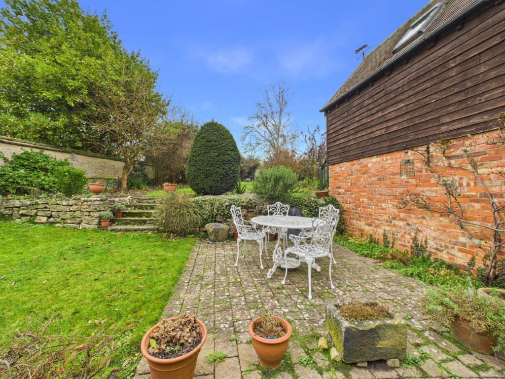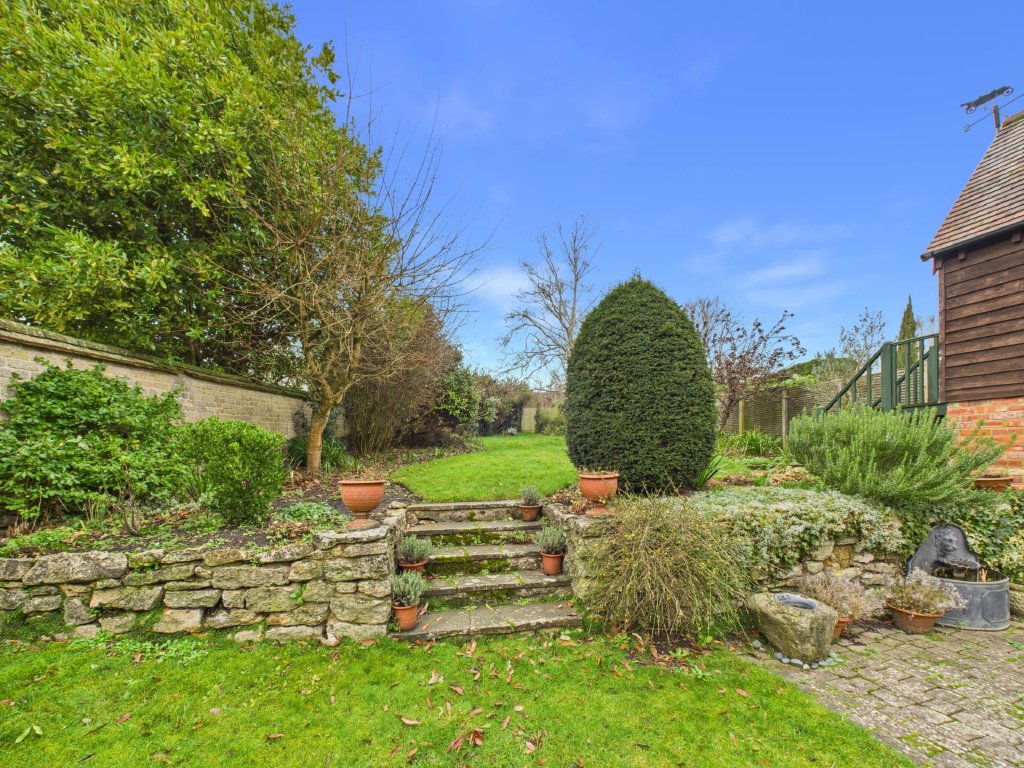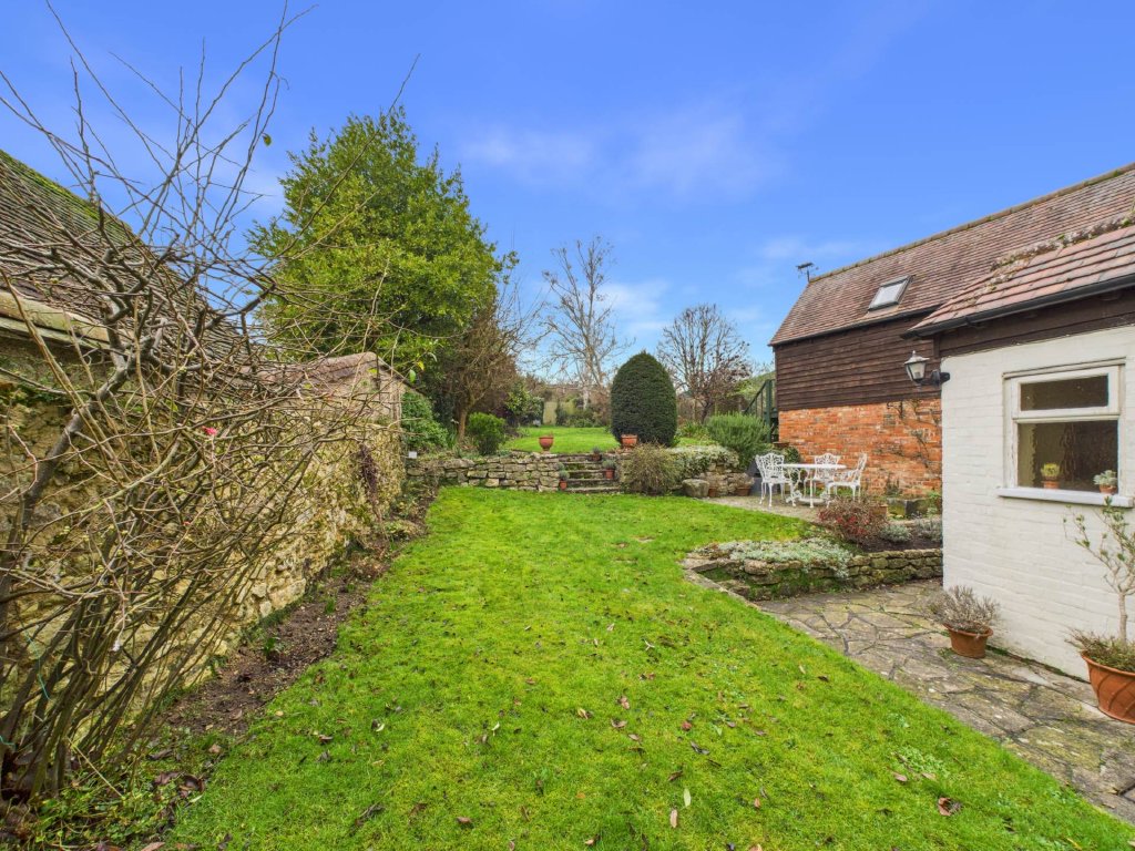 The gardens to the rear are a particular feature, thoughtfully landscaped and arranged over two levels to create a private and tranquil setting. A stone terrace directly behind the cottage provides an ideal space for outdoor seating, while steps lead up to a generous lawn bordered by established herbaceous planting. A further raised terrace offers an excellent spot for al fresco dining and entertaining.