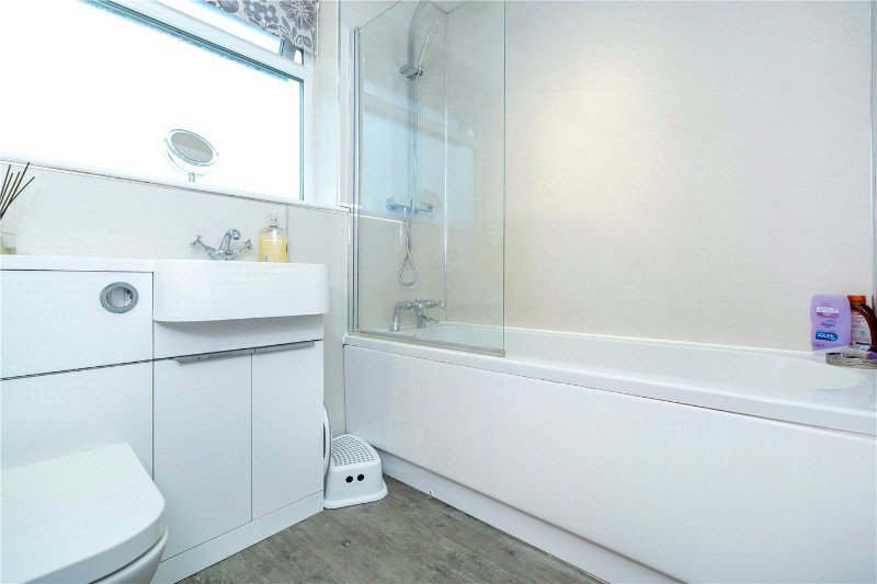 With frosted UPVC window to the rear aspect, comprising a refitted modern three-piece suite, low level WC, wash hand basin set in vanity unit and panel bath with glass screen and rain shower over, aqua board, chrome heated towel rail and finished with wood effect flooring.