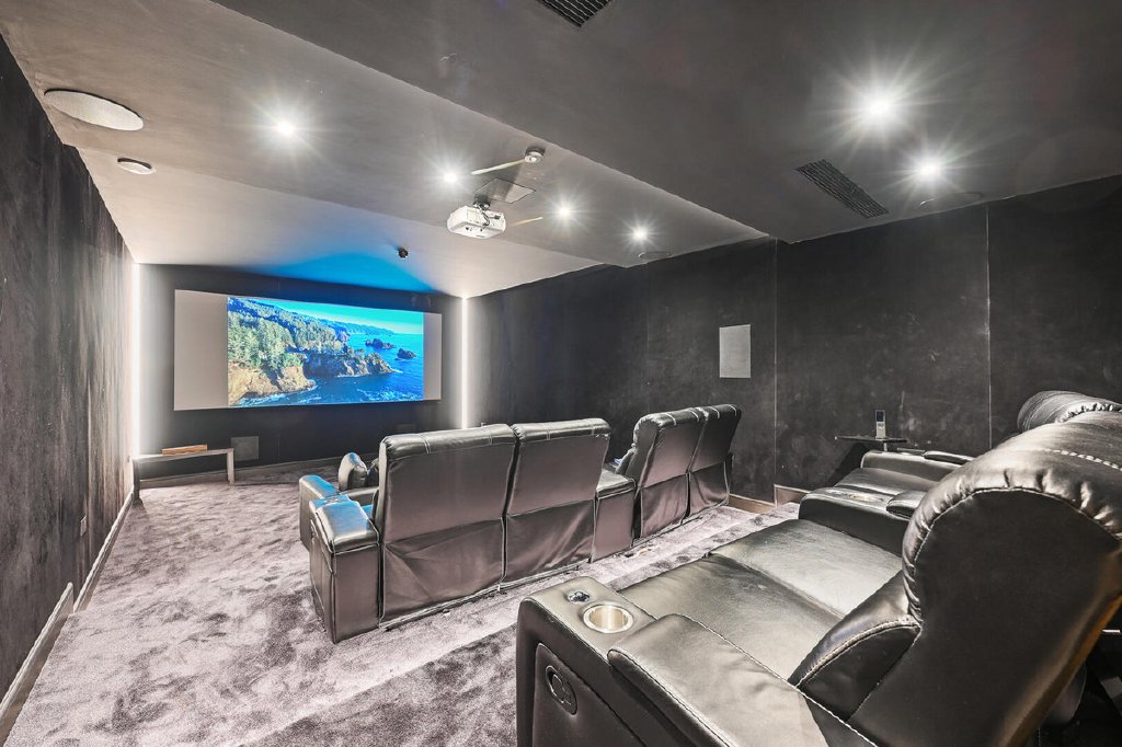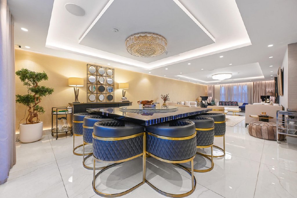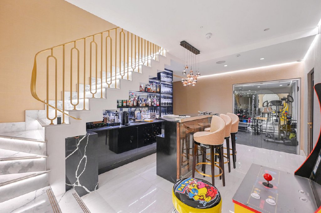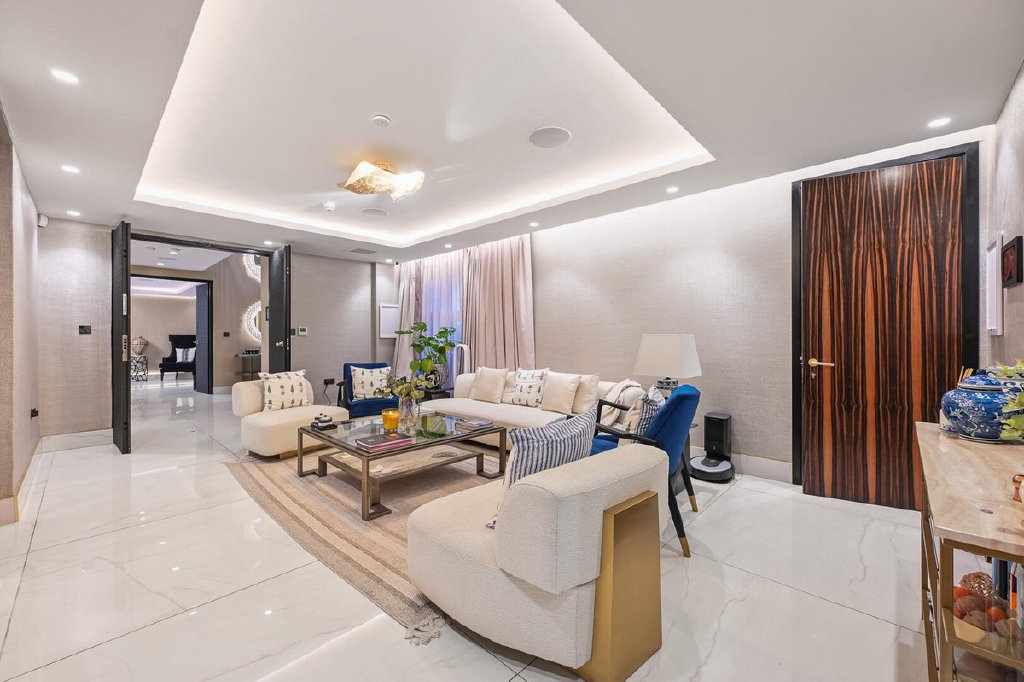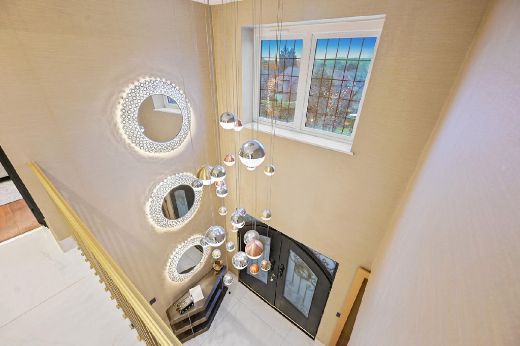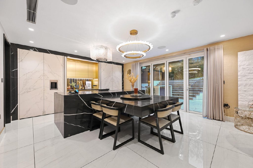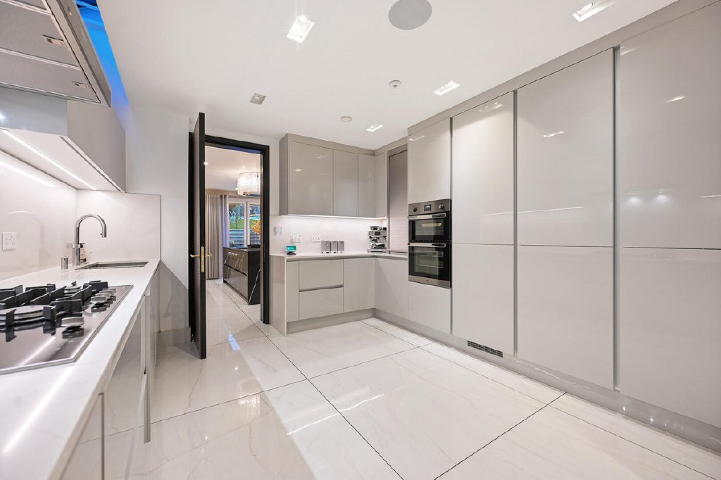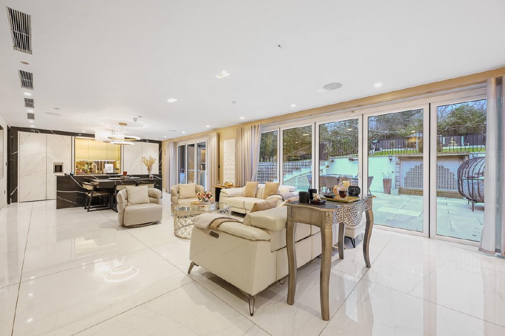 The house is designed for both family living and entertaining, with a grand entrance hall and sweeping staircase leading to a vast open plan living space incorporating sitting, dining and breakfast areas, alongside a bespoke kitchen with Neolith Calacatta cabinetry, Gaggenau appliances and premium finishes. A second fully equipped kitchen further supports entertaining. Additional ground floor accommodation includes a family room, study and an en suite bedroom ideal for a housekeeper or au pair.