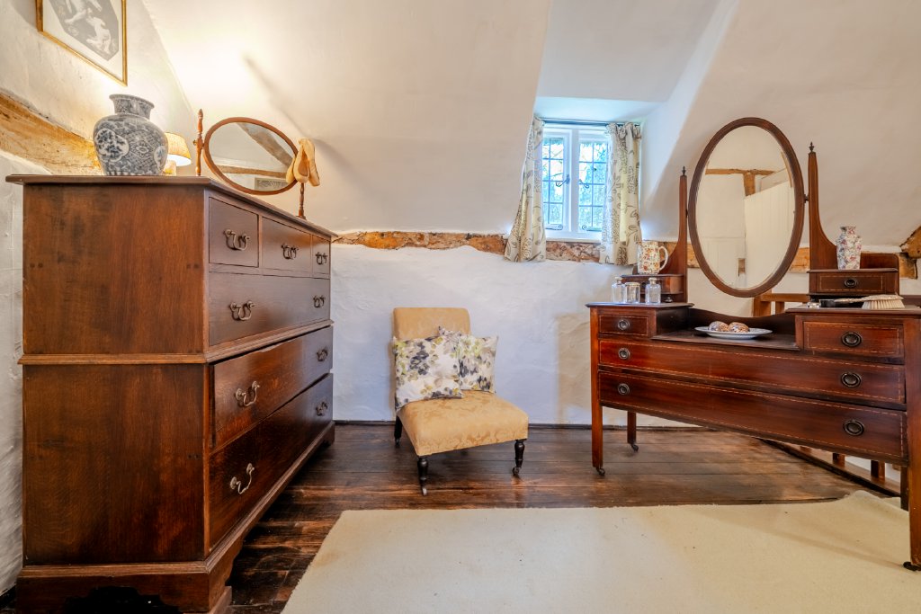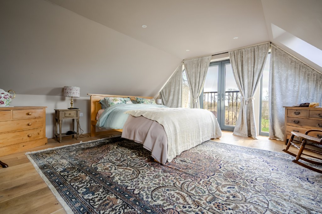 The first floor of the original cottage accommodates two generous double bedrooms, served by a family bathroom, each room continuing the homes narrative of character and comfort. The principal bedroom suite, positioned within the rear extension, is a particularly special feature, enjoying breathtaking views over the garden and benefitting from a stylish en-suite bathroom. This peaceful retreat offers privacy, light and a strong connection to the surrounding landscape.
