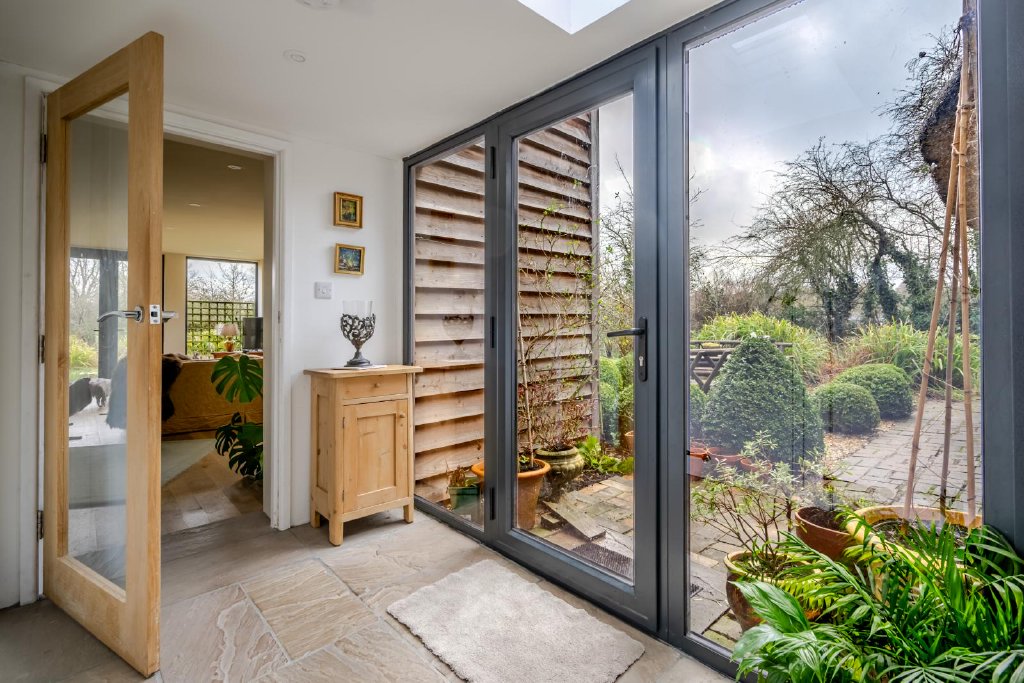 To the rear, a striking and thoughtfully designed contemporary extension provides a wonderful contrast to the historic fabric of the house. Flooded with natural light and offering uninterrupted views across the gardens, this impressive family room creates a superb space for year-round enjoyment, perfectly framing the outdoor setting and blurring the line between inside and out.