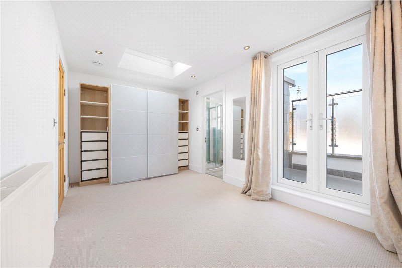 The first floor provides three well-proportioned bedrooms and a contemporary family bathroom, with bedroom two benefiting from a walk-in wardrobe. The top floor is dedicated to an impressive principal suite with built-in storage and a sleek en suite shower room, alongside a further fifth bedroom. The principal bedroom also enjoys direct access to a private roof terrace.