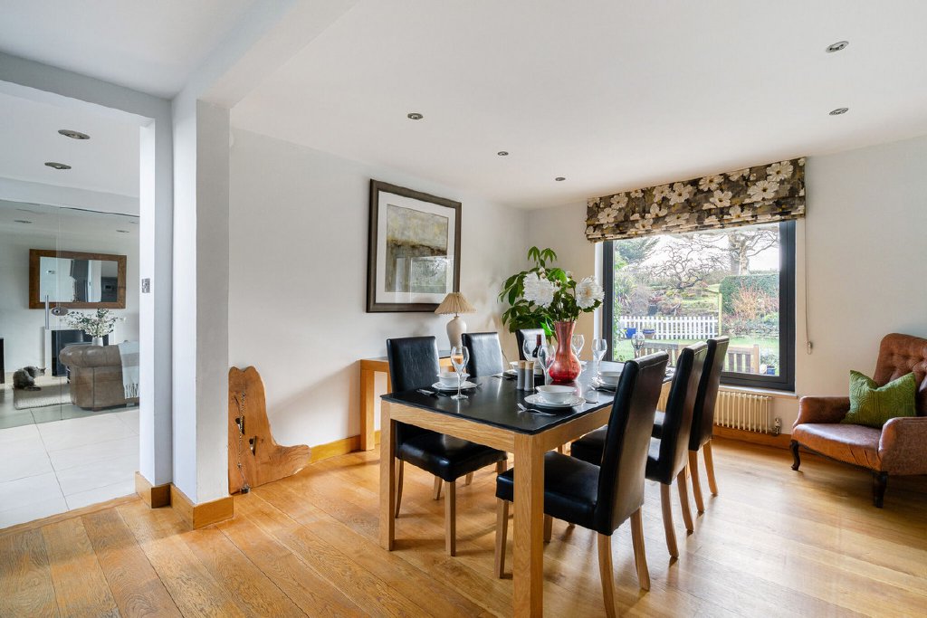 The formal dining room provides an exceptional setting for entertaining with twin glass doors, delicately etched with a map of Thursley, reflect the craftsmanship and thoughtful detailing evident throughout the home.