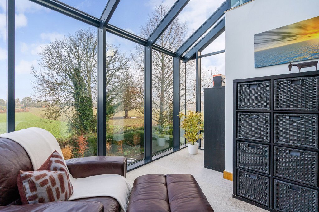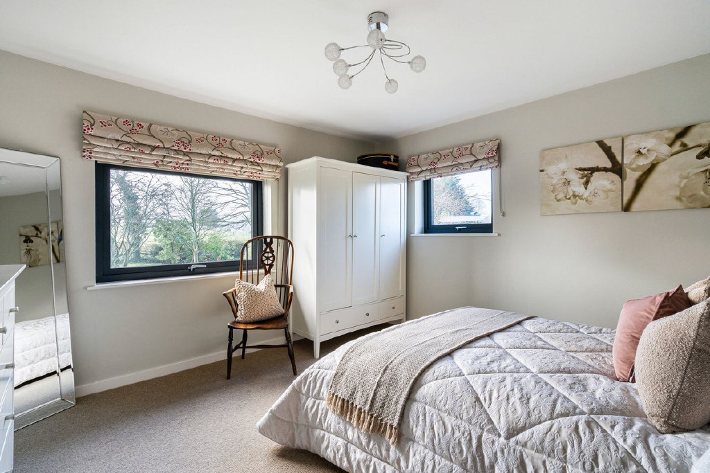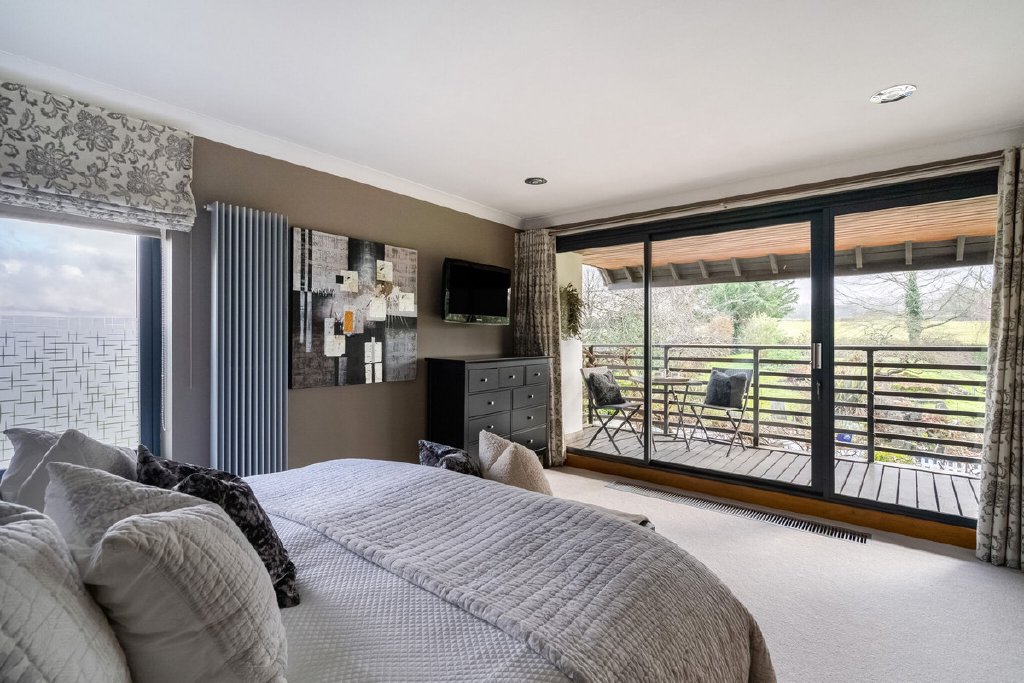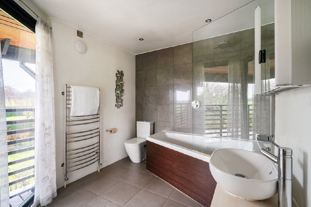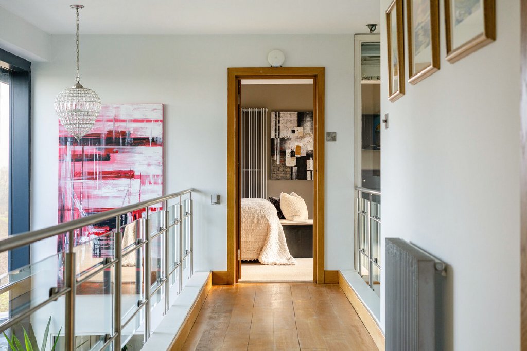 Upstairs, a galleried landing enhances the home’s wonderful sense of volume and light. The principal suite is a luxurious retreat, complete with an elegant ensuite and sliding doors opening onto a private south-facing balcony — the perfect vantage point from which to enjoy tranquil countryside views. Two further bedrooms, a home office, a dressing room and a Jack and Jill bathroom complete the first floor.