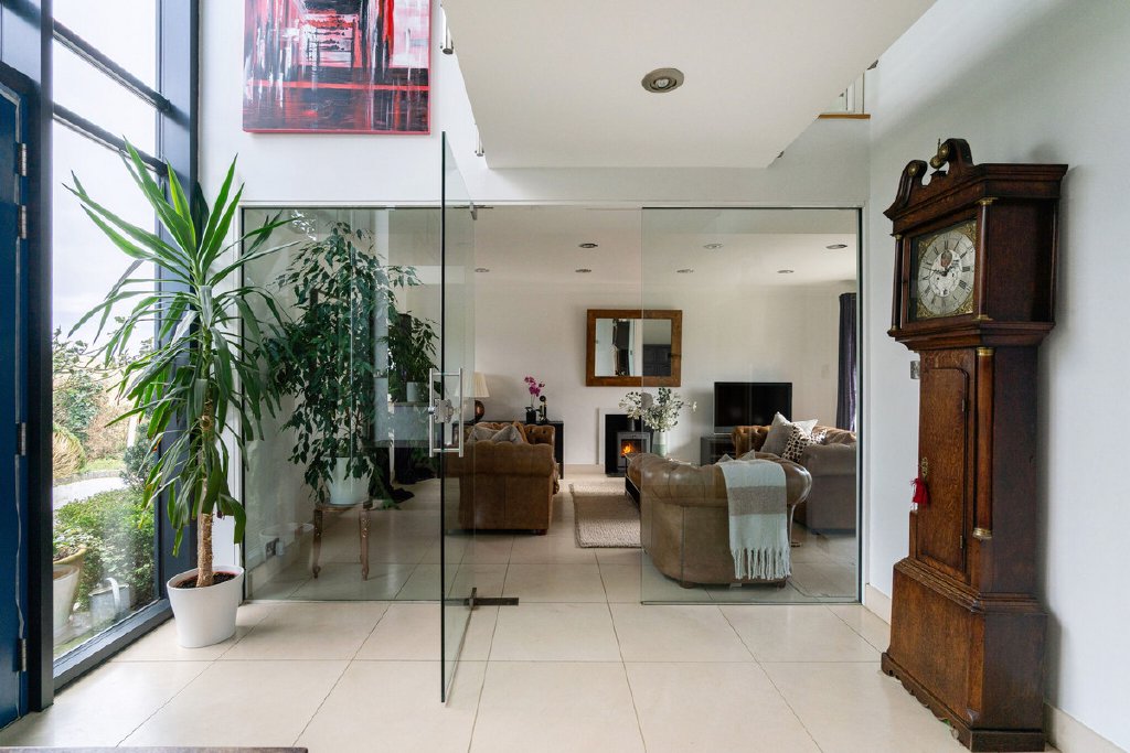 The front door opens into an impressive reception hall, where striking double-storey windows flood the space with natural light. A superb reception room features sliding French doors that open seamlessly onto the terrace and landscaped gardens, creating an effortless connection between indoor and outdoor living.