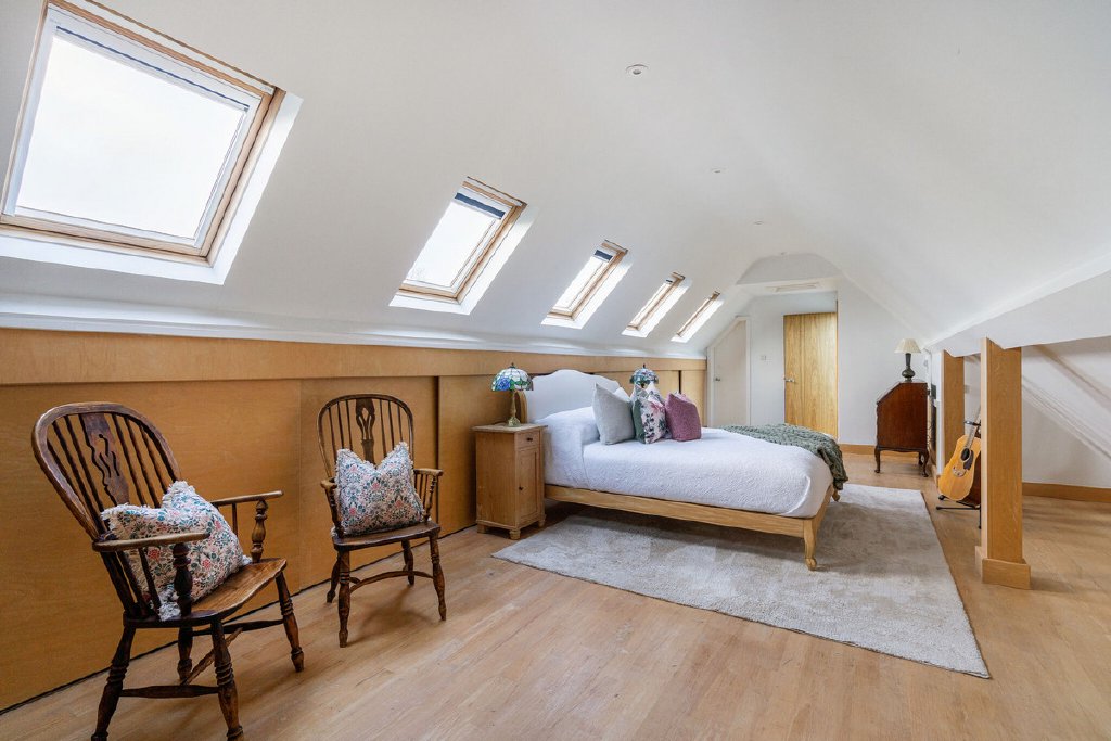 The second floor offers remarkable versatility, featuring an additional bedroom with far-reaching views and an impressive 32-foot room illuminated by skylights. Subject to the necessary planning permissions, a further room could be transformed into a bathroom, creating an outstanding floor-wide suite ideal for guests or an exceptional teenage retreat.