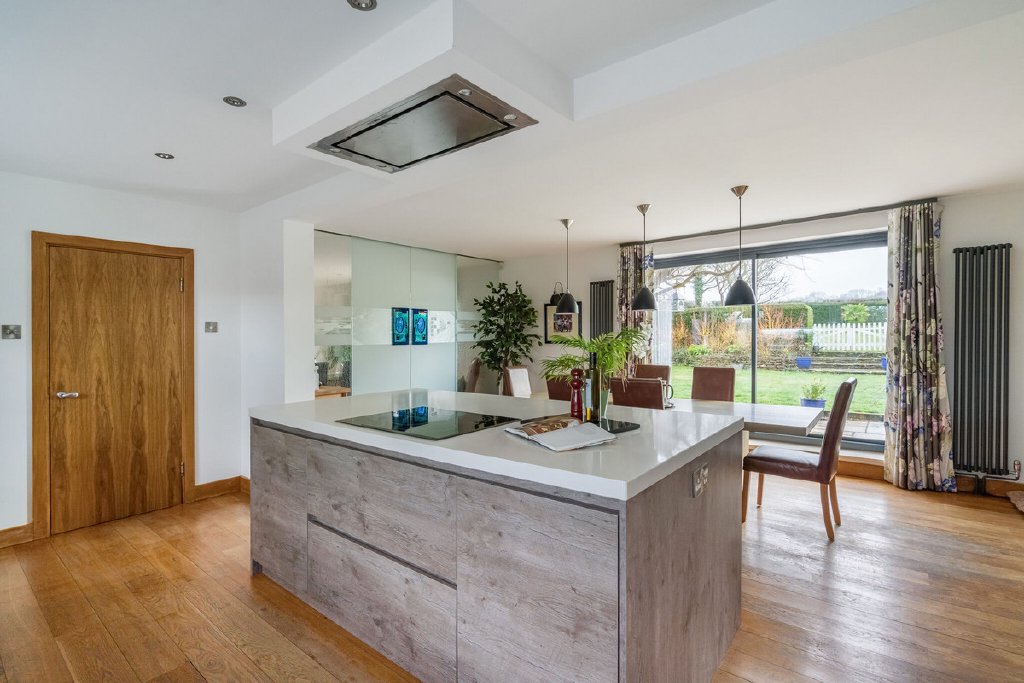 At the heart of the property lies a spectacular 35-foot open-plan kitchen and family room — a contemporary yet inviting space designed for modern living. A suspended log burner forms a dramatic focal point, while the kitchen combines style with functionality through sleek cabinetry, a central island, high-spec integrated appliances. Additionally the ground floor benefits from generously proportioned utility room complemented by a useful back glass porch.