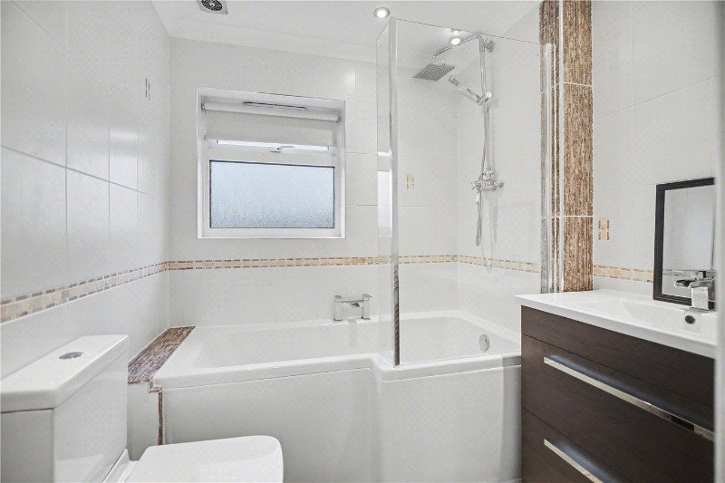 The family bathroom is well-appointed with an L-shaped bath and rainfall shower over, WC and wash basin with storage beneath, complemented by tiled walls and wood-effect flooring.