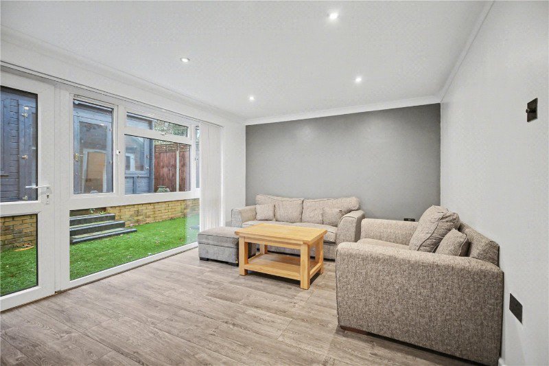 The sitting room offers a well-proportioned and more formal reception space, featuring wood-effect flooring, a feature fireplace and direct access to the rear garden, enjoying a pleasant outlook.