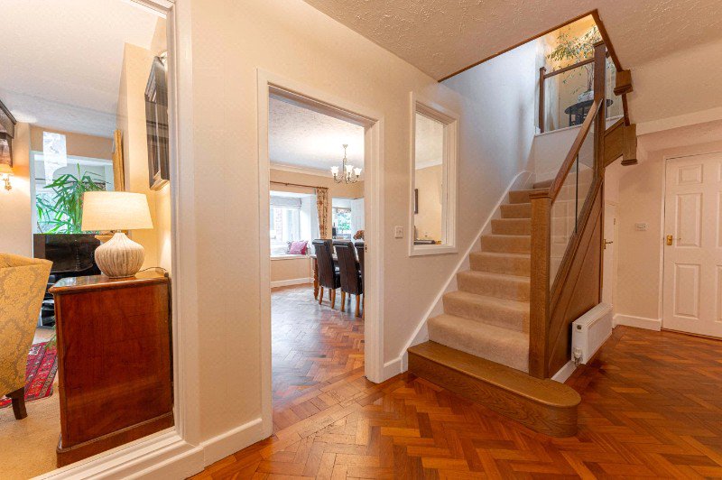 The property is entered via a welcoming entrance hall, finished with parquet flooring and providing access to all principal ground-floor rooms, together with a discreet downstairs WC and staircase rising to the upper floors.