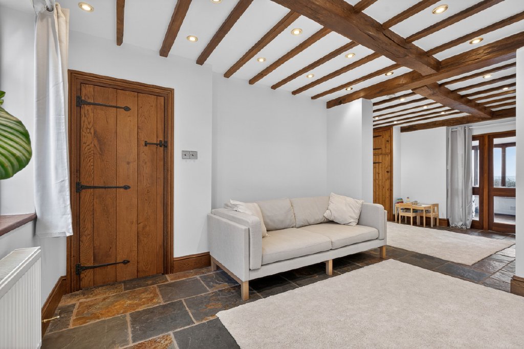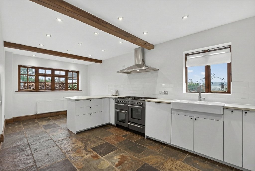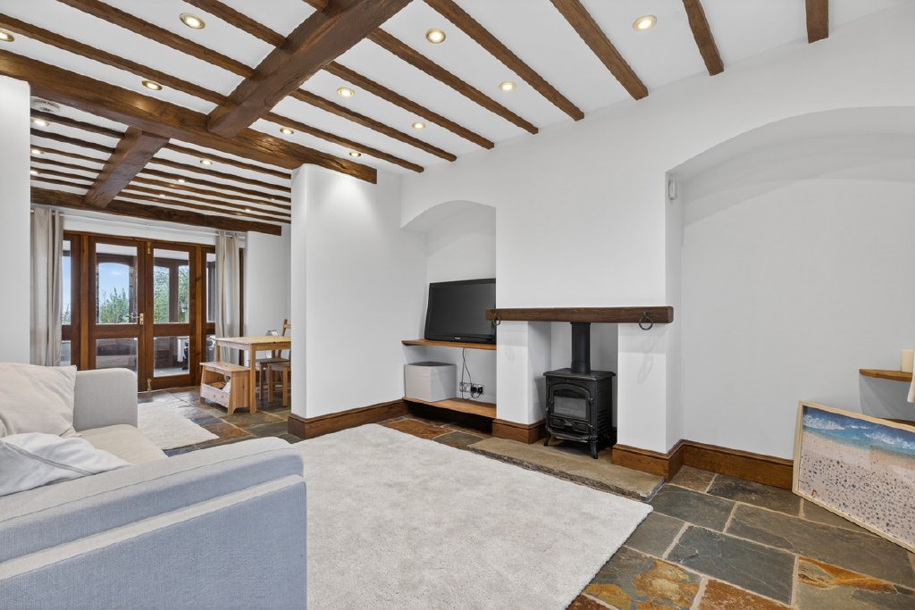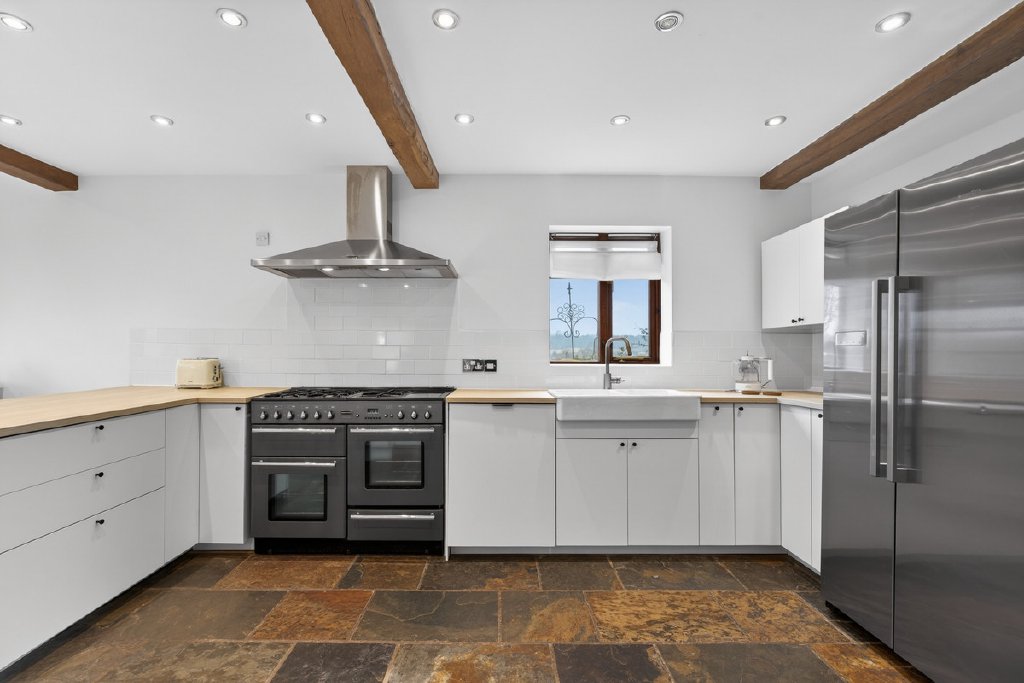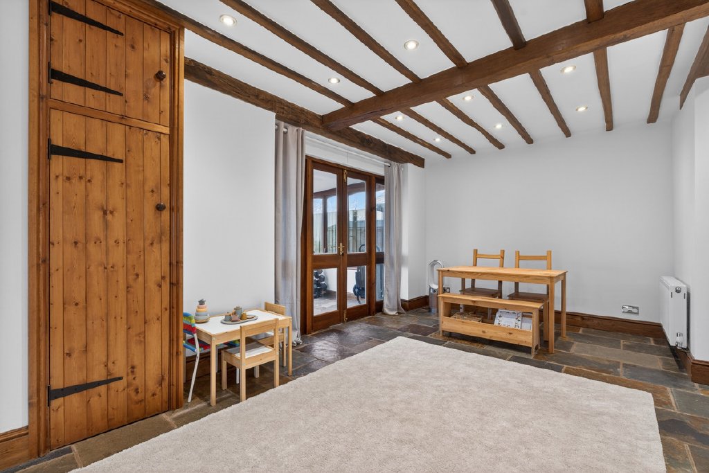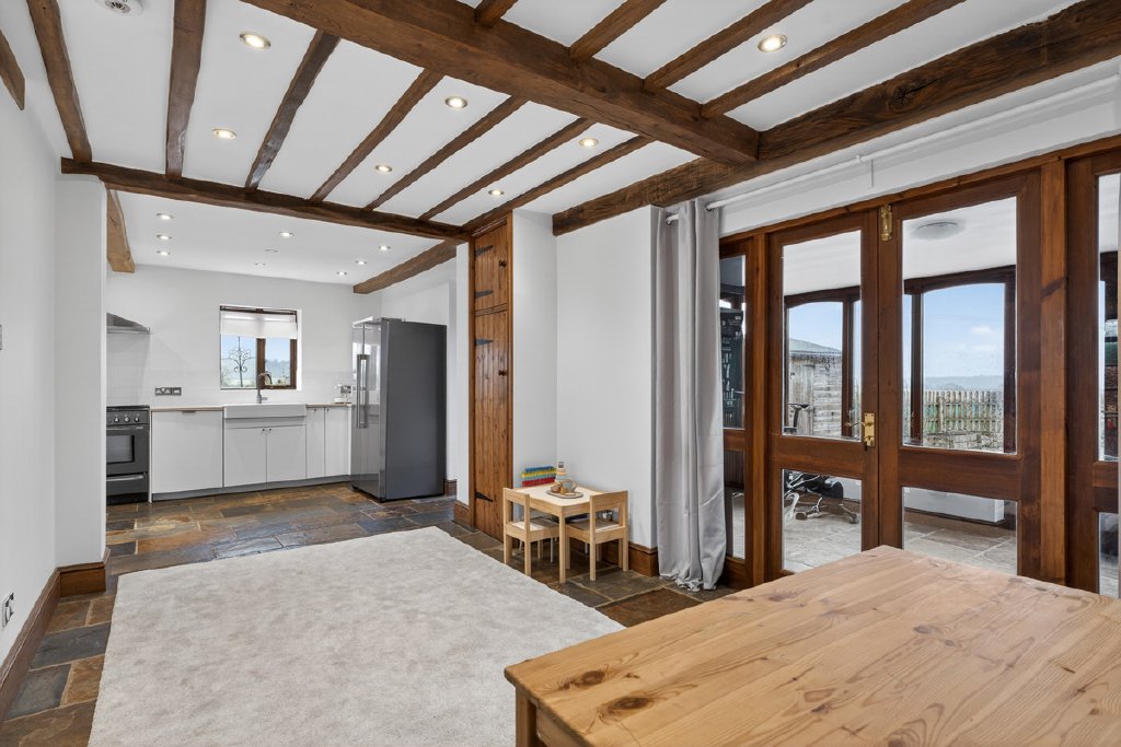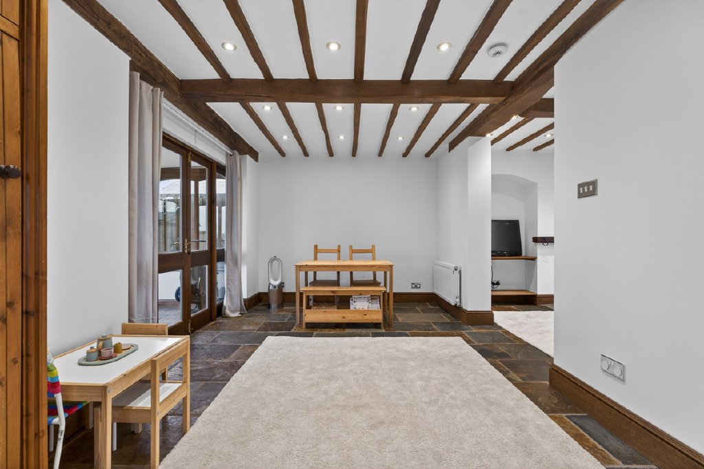 The heart of the home is the impressive open-plan kitchen, dining and living space — perfectly designed for modern family life and entertaining. Recently refurbished, the space is unified by natural slate flagstone flooring, creating a seamless flow while allowing clearly defined areas for cooking, dining and relaxation.