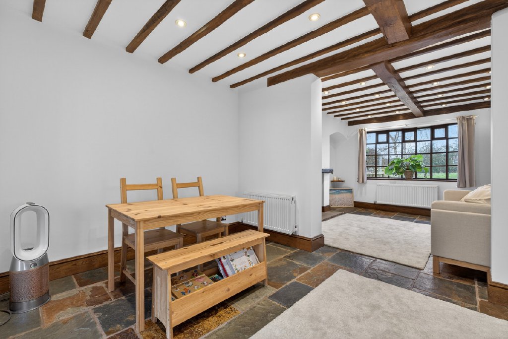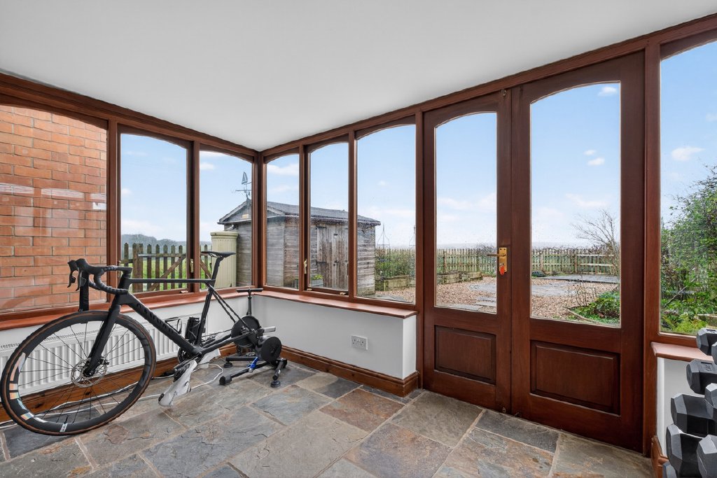 The thoughtfully designed kitchen blends style with practicality, featuring a range-style gas cooker, Belfast sink, breakfast bar, integrated dishwasher and space for an American-style fridge freezer. The dining area is ideal for hosting, with double doors opening into a generous conservatory that floods both spaces with natural light and frames the far-reaching countryside views beyond.