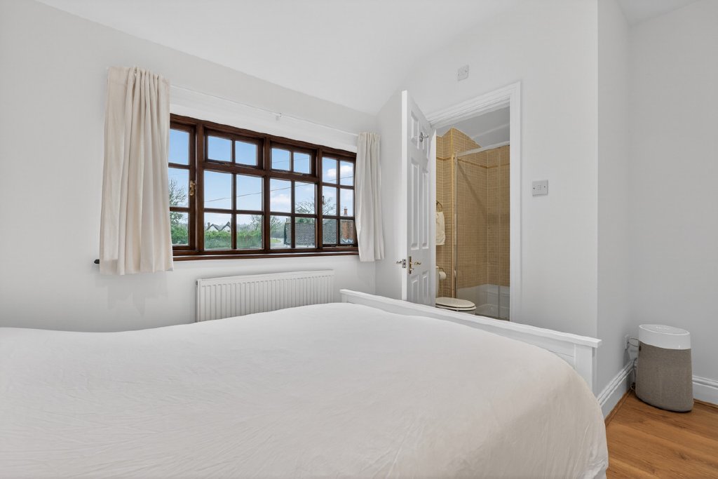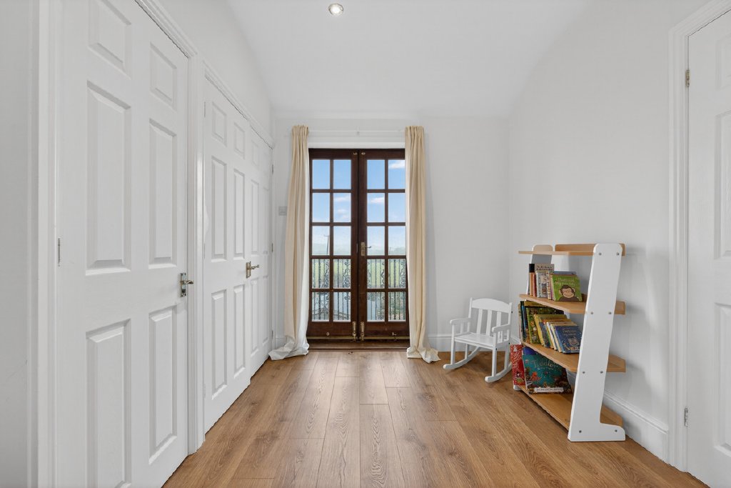 To the rear, a further spacious double bedroom enjoys built-in wardrobes and the added luxury of a private balcony — an ideal spot to enjoy morning coffee while taking in the far-reaching countryside views.