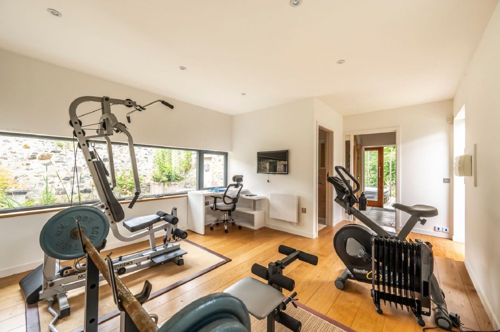 The accommodation is superbly appointed, with six stylish en-suite bedrooms providing flexible options for family and guests, complemented by a bright garden room, a large dedicated home office, both casual and formal dining areas, and a characterful wine cellar for the enthusiast. A detached gym or yoga studio with spa facilities overlooks the gardens, offering a private sanctuary for wellbeing, retreat and entertaining.